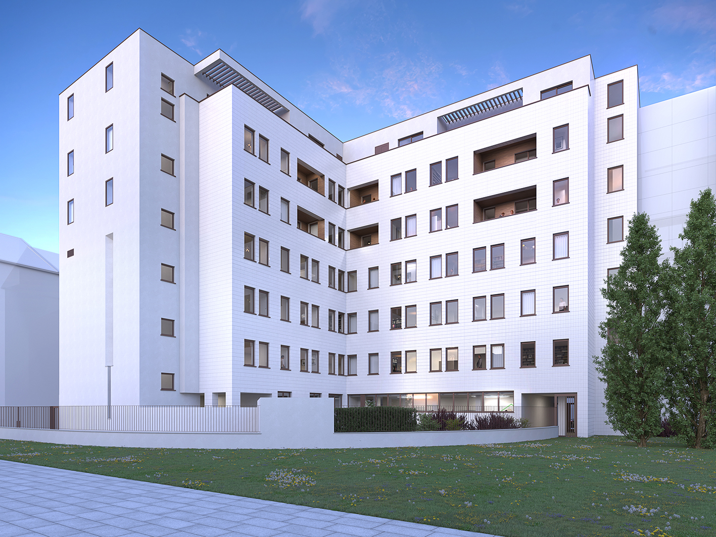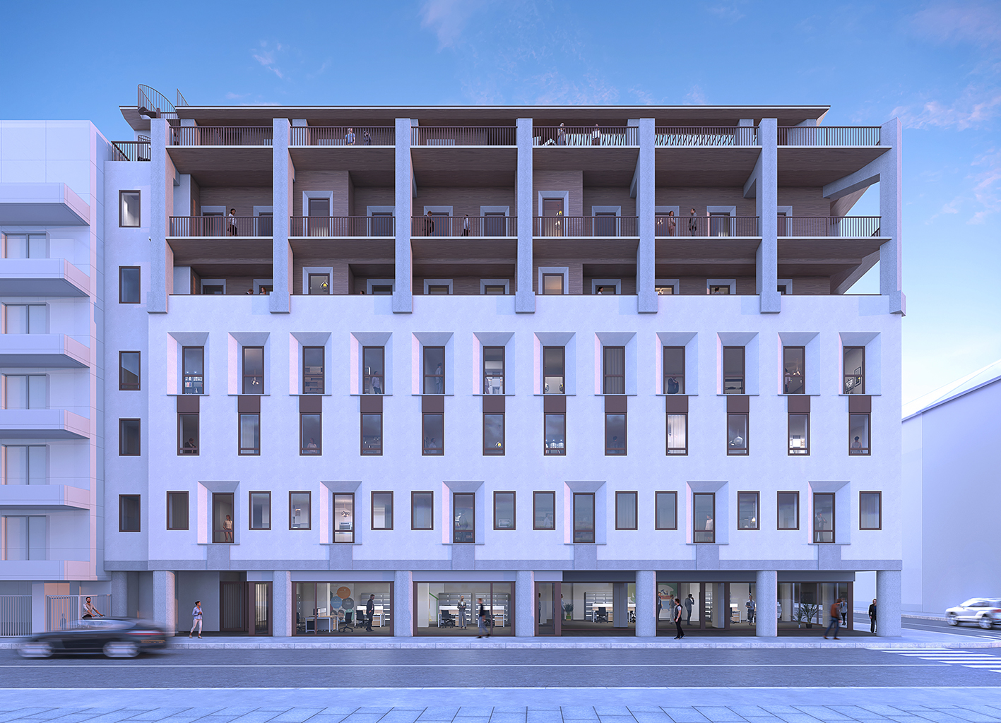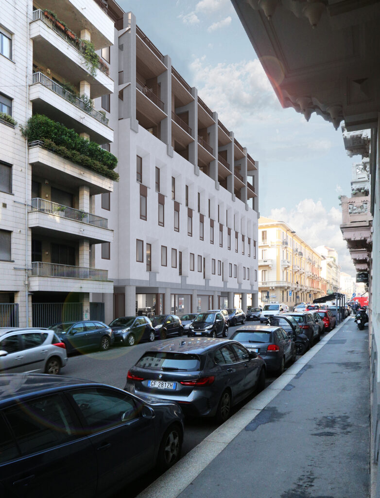 Nel progetto sviluppato da Archi-tekton, un ruolo centrale è stato attribuito alla ridefinizione della facciata su strada. Attraverso l’eliminazione di alcuni elementi incoerenti tipici del linguaggio postmoderno, la composizione è stata semplificata mediante l’introduzione di portali e logge. Il sesto piano è stato inoltre arretrato, con l’obiettivo di ridurne l’impatto visivo. Sulla facciata interna, a partire dalle aperture esistenti, sono state ricavate nuove logge. Sia per la facciata interna sia per quella su strada è prevista una tinteggiatura di colore bianco, scelta che consente di armonizzare meglio l’edificio con il contesto circostante.