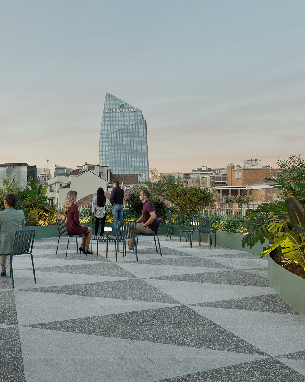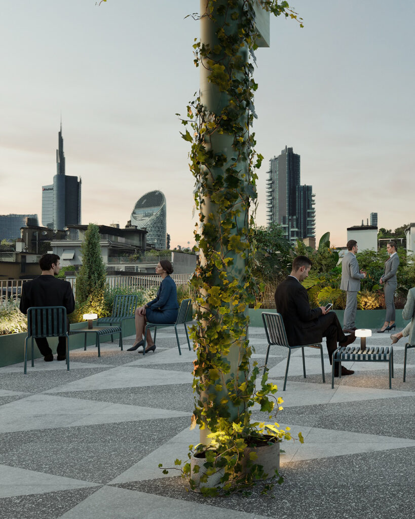 Gli spazi sono riorganizzati per favorire flessibilità, con aree polifunzionali al piano interrato, tra cui auditorium e sale riunioni. Il verde si estende anche alle balconate e alla terrazza al quinto piano, che offre una vista su Milano.
