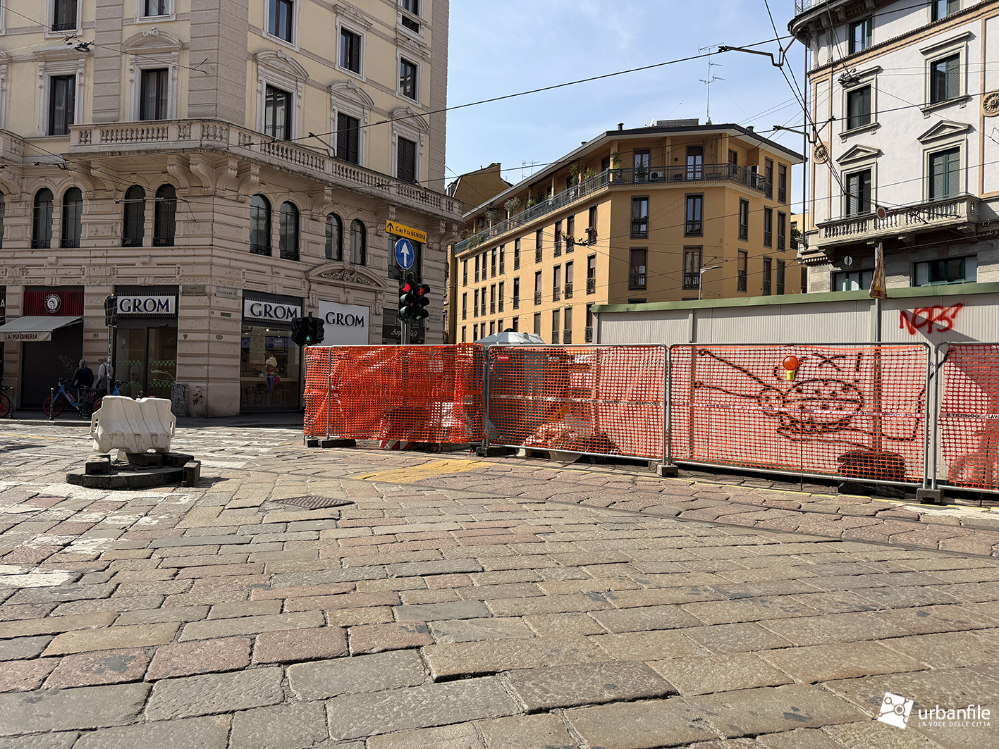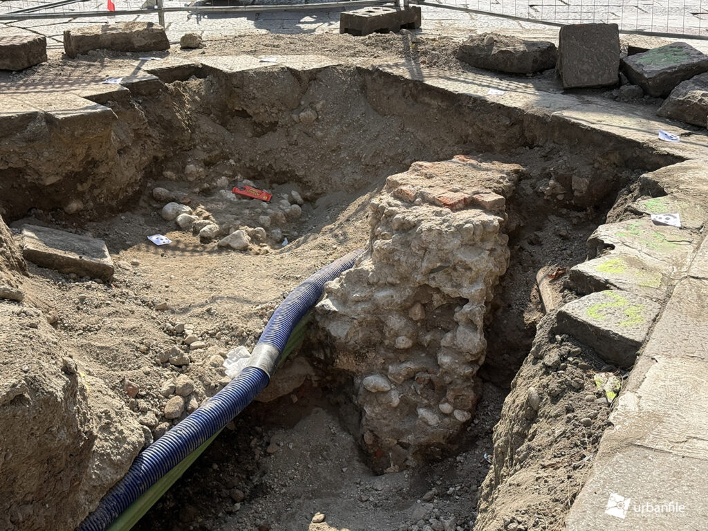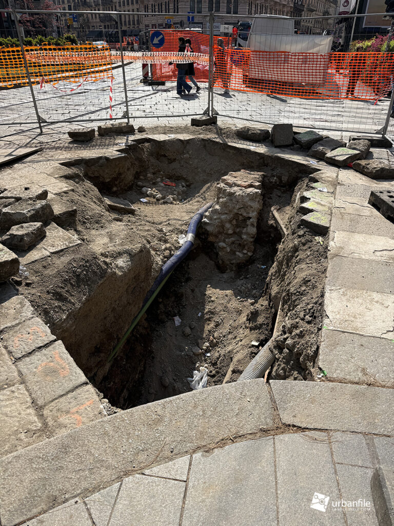 Al carrobbio sono in corso i lavori ai sottoservizi. Da uno scavo è anche affiorato un muro di qualche probabile edificio qui presente prima delle devastazioni belliche.