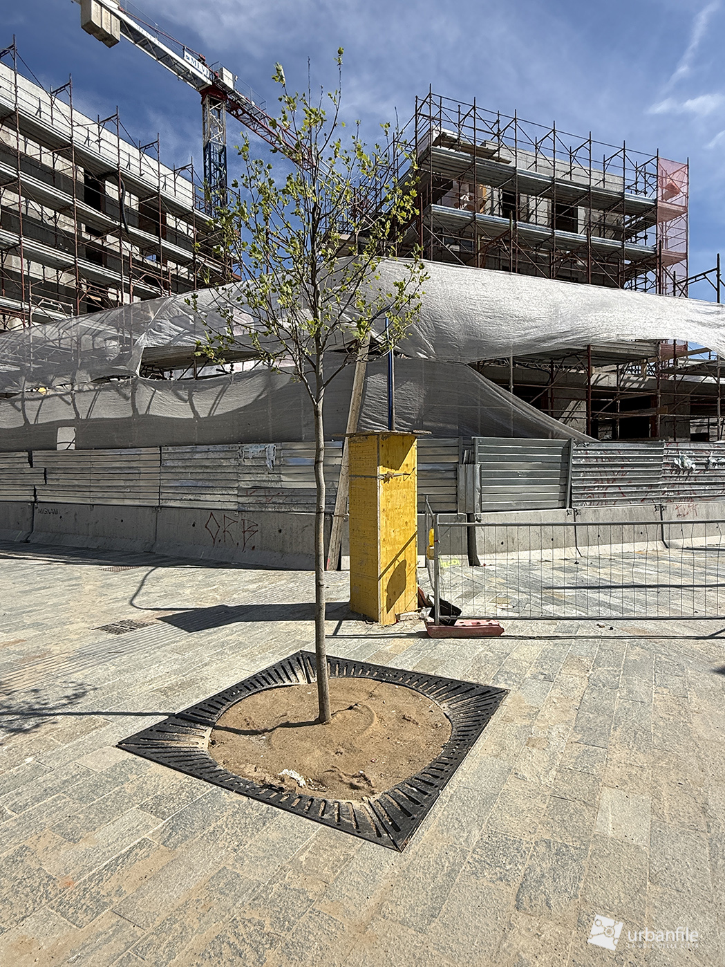 Ci siamo spostati ora dove si trova la stazione della metropolitana M4 e dove via Paolo Segneri incrocia via dei Sanniti (via Recoaro e Manzano). Una parte è stata già completata da oltre un anno (quella dove vengono parcheggiate selvaggiamente le automobili). L’altro lato vede ancora il cantiere per il completamento, e dove compare il secondo “albero tecnologico”.
