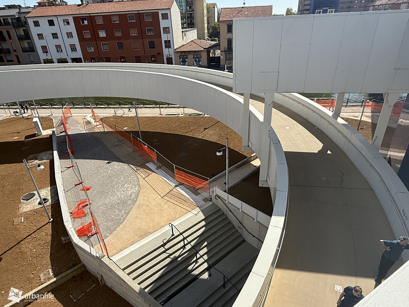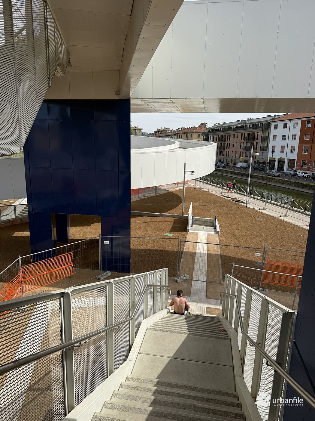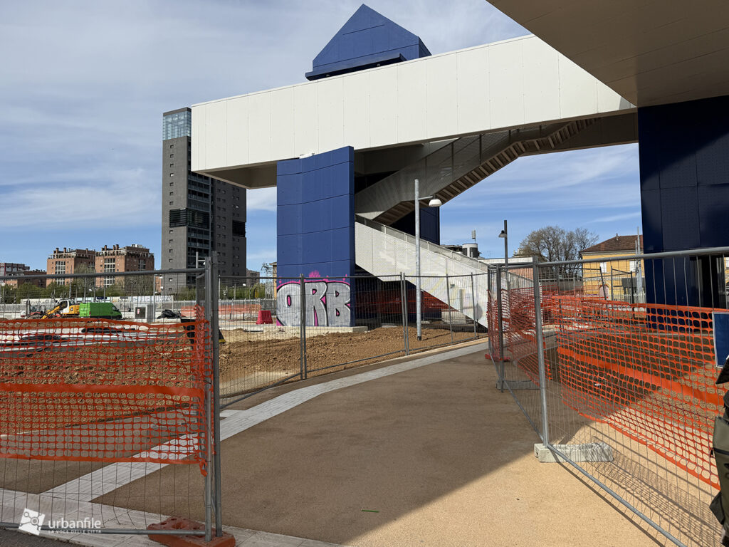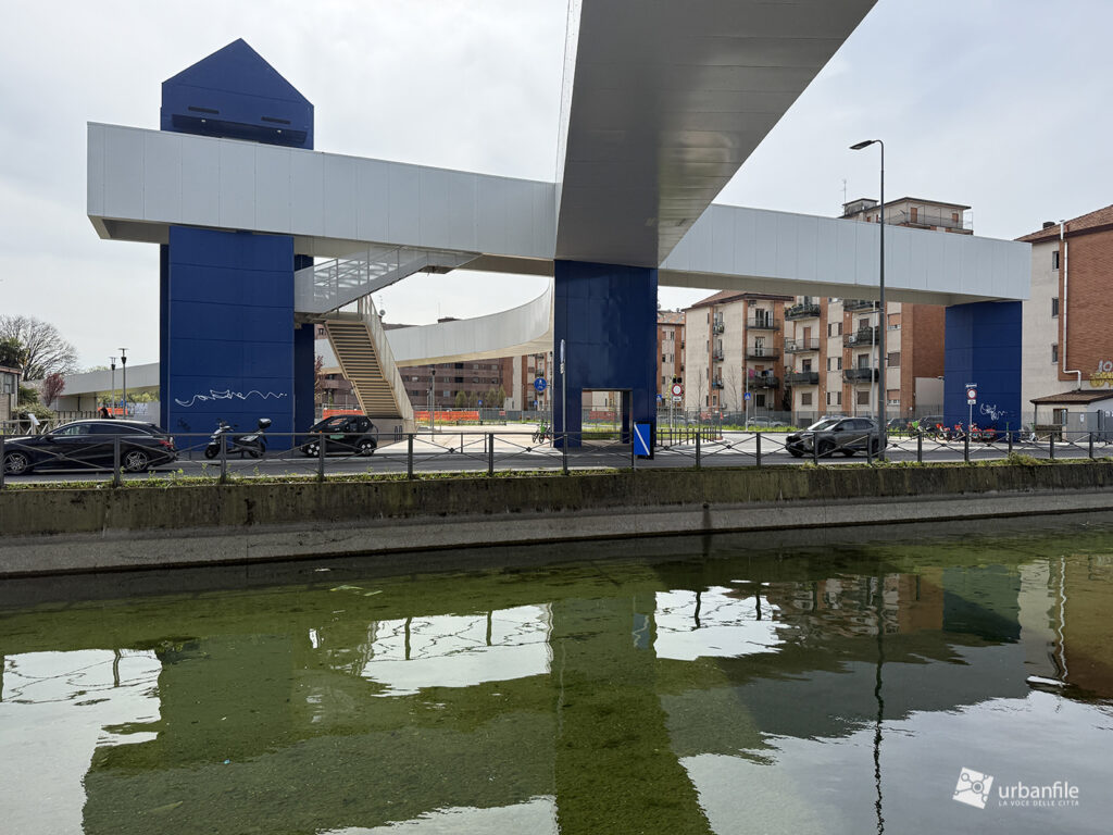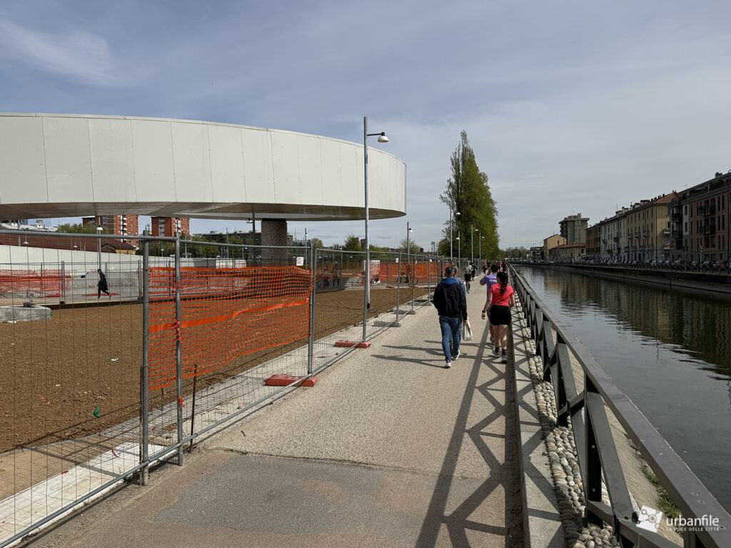 La parte centrale della passerella sorvola via Lodovico il Moro, il Naviglio Grande, l’entrata alla stazione M4 e la ferrovia. Quest’area dovrebbe comprendere un giardino, ma al momento è ancora in allestiemnto.