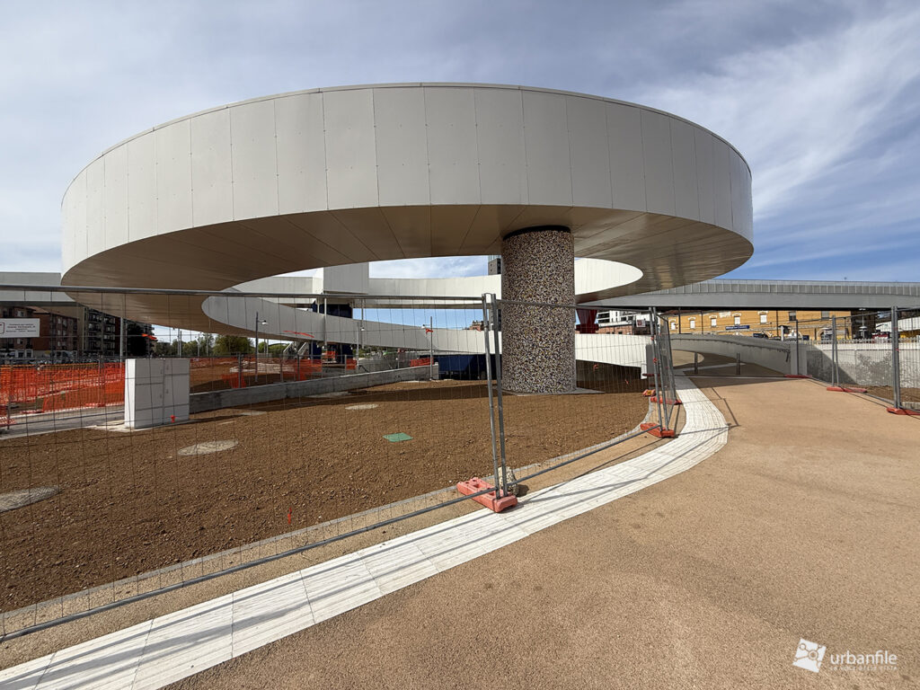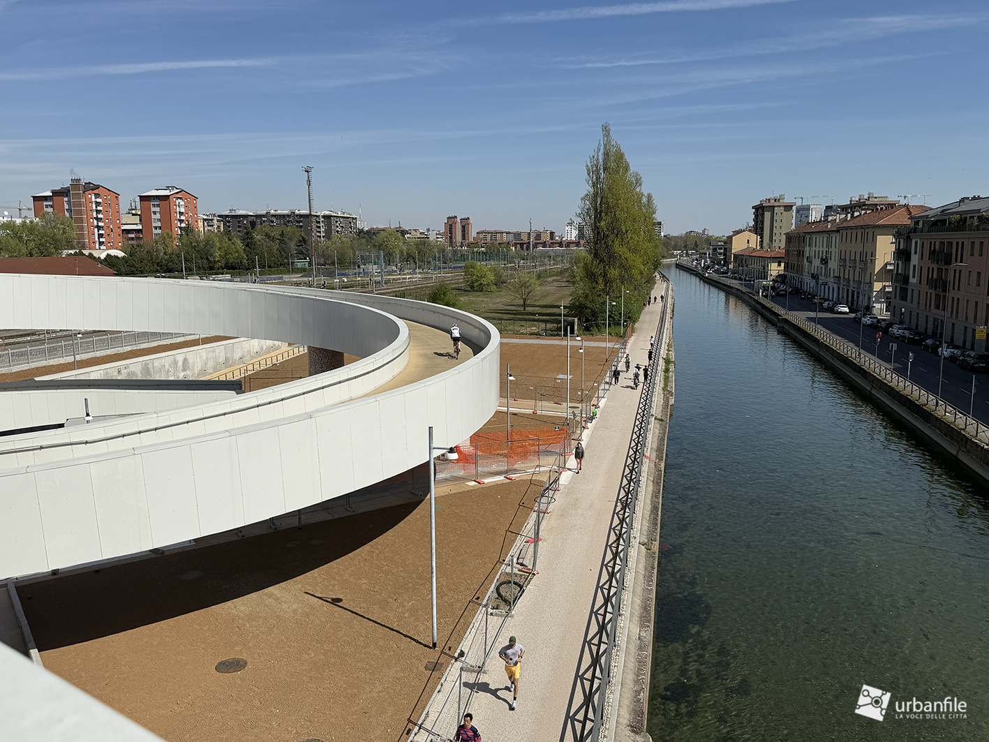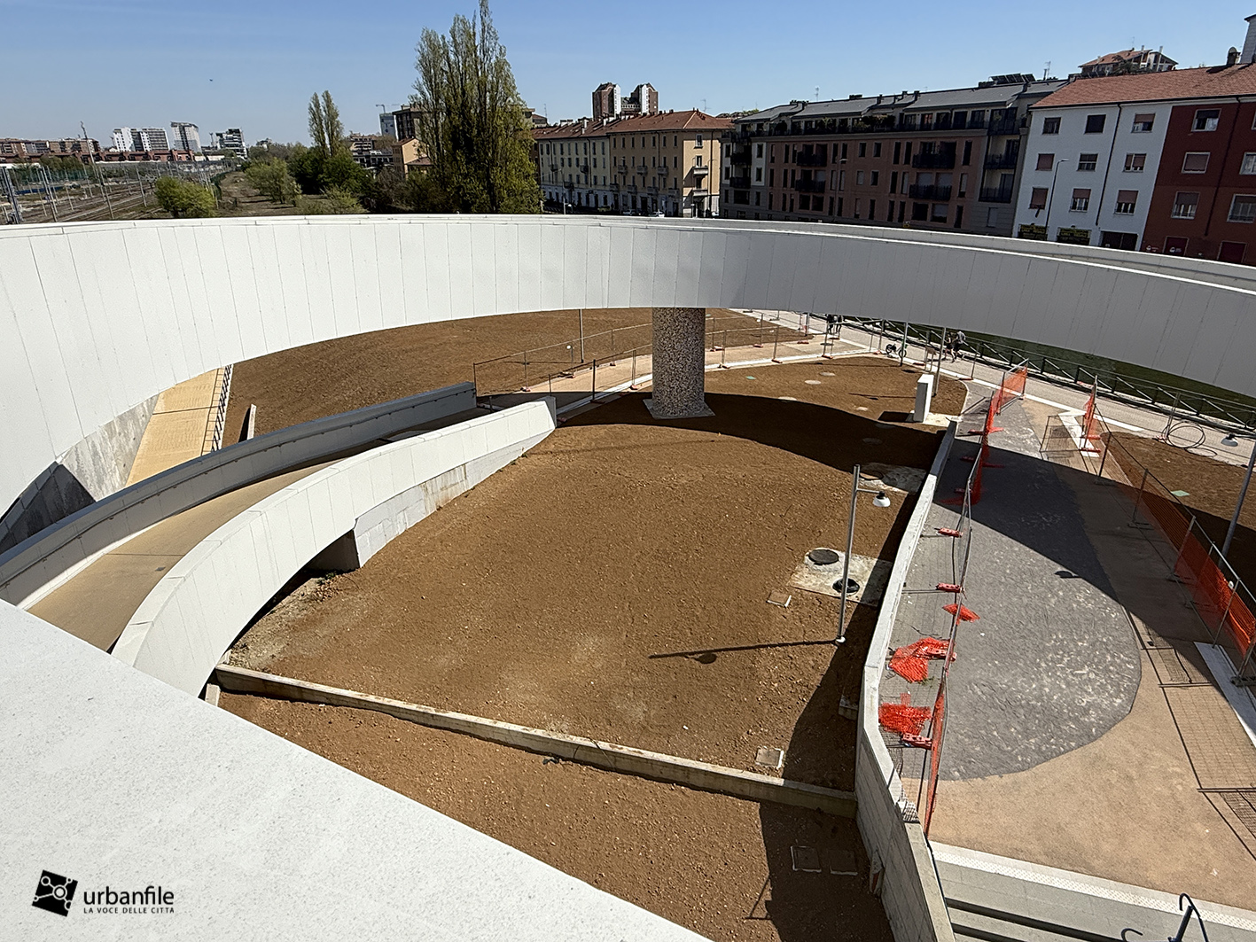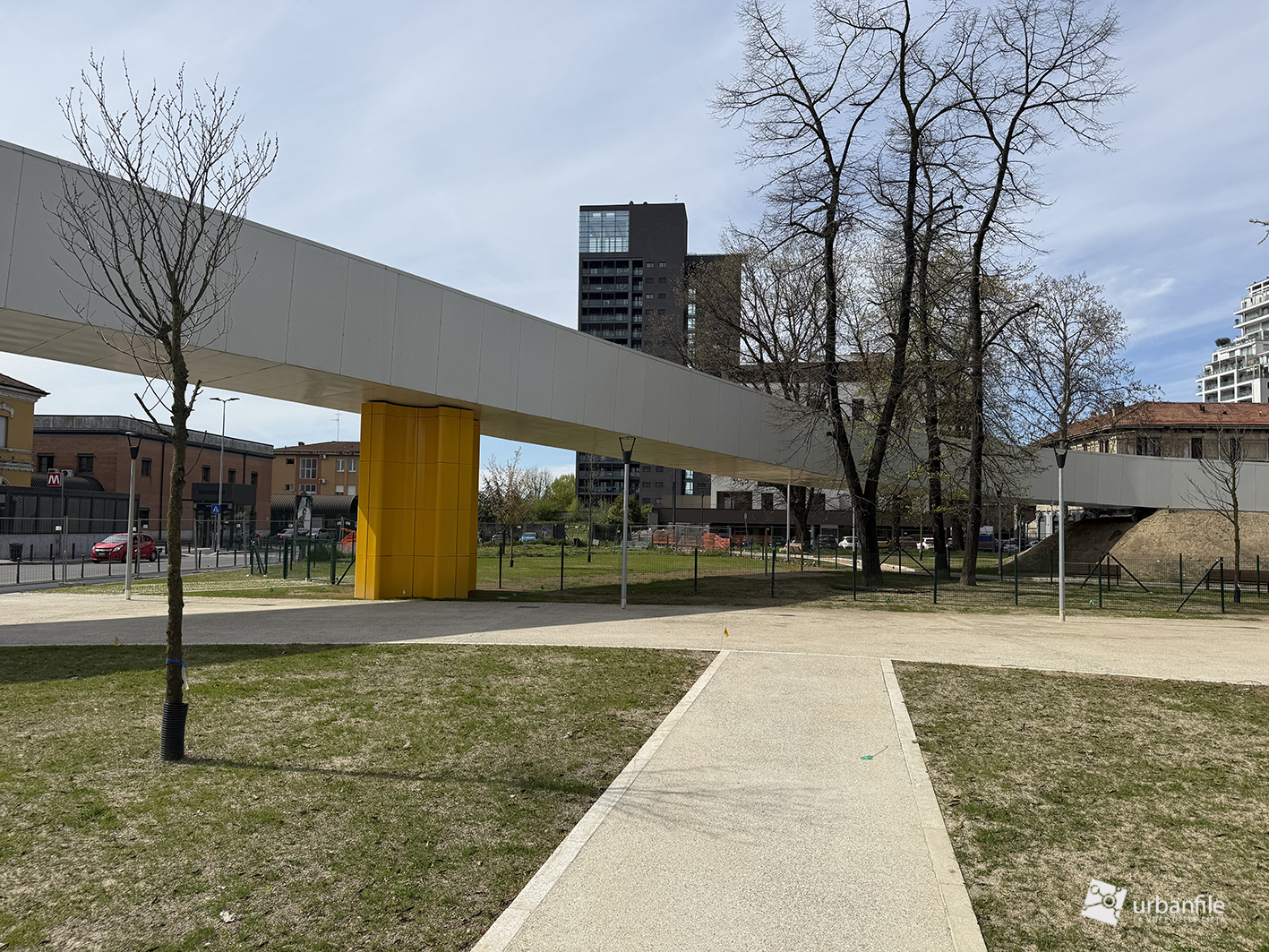 La parte centrale della passerella sorvola via Lodovico il Moro, il Naviglio Grande, l’entrata alla stazione M4 e la ferrovia. Quest’area dovrebbe comprendere un giardino, ma al momento è ancora in allestiemnto.