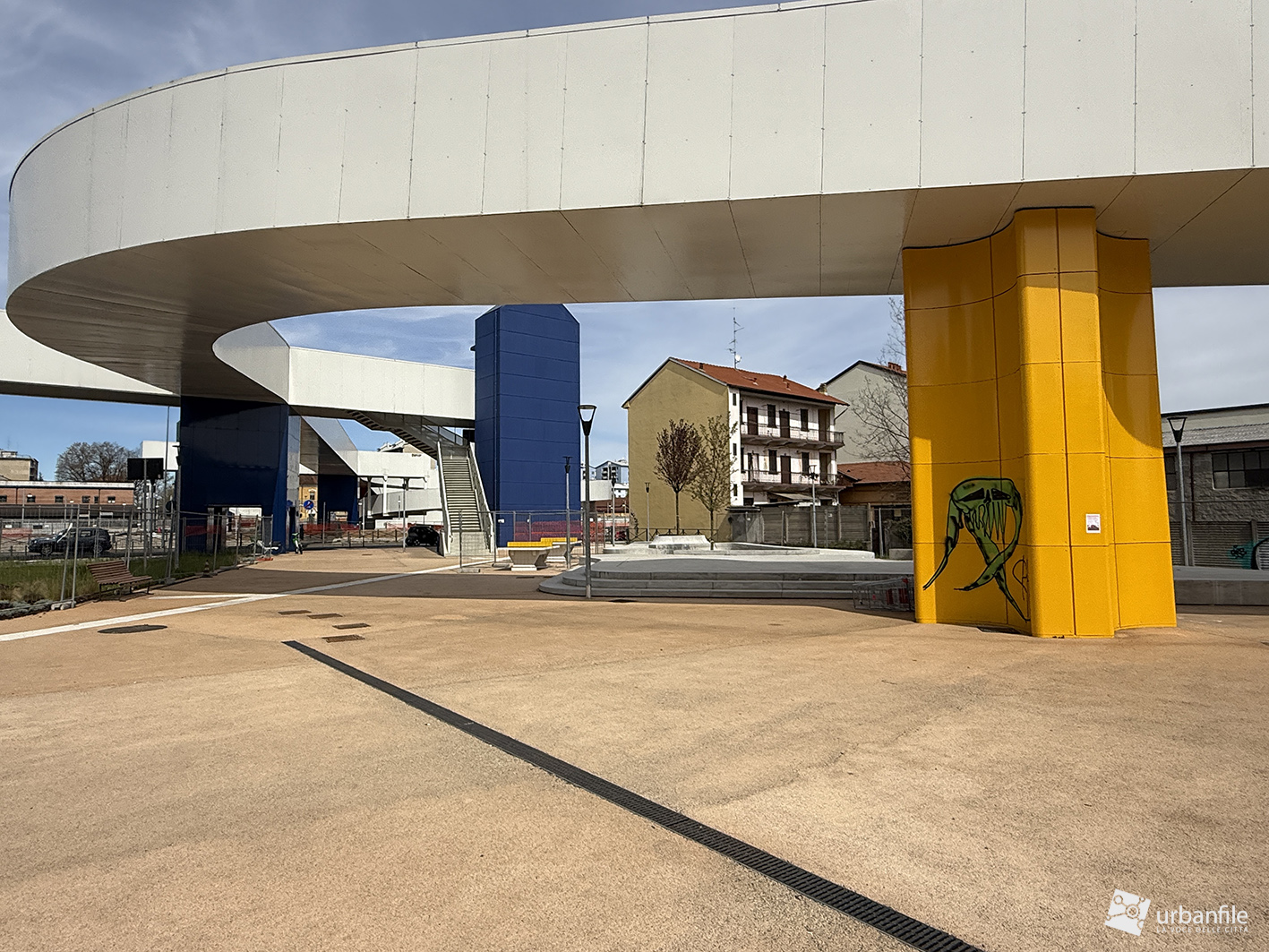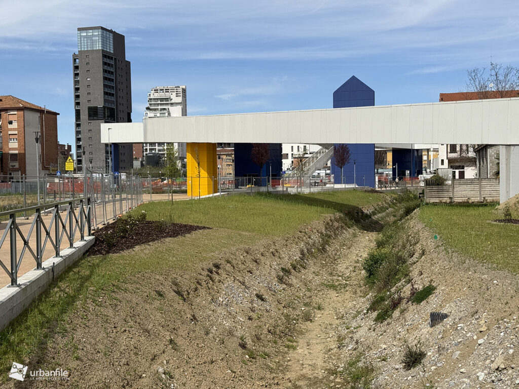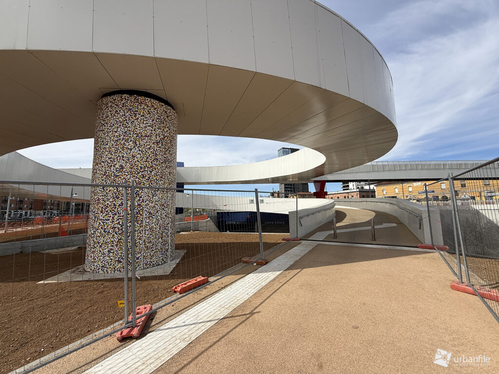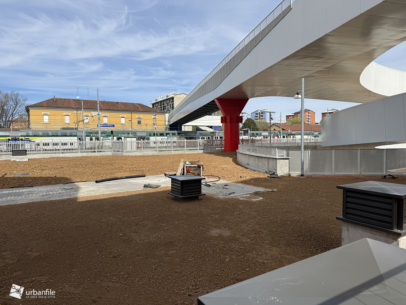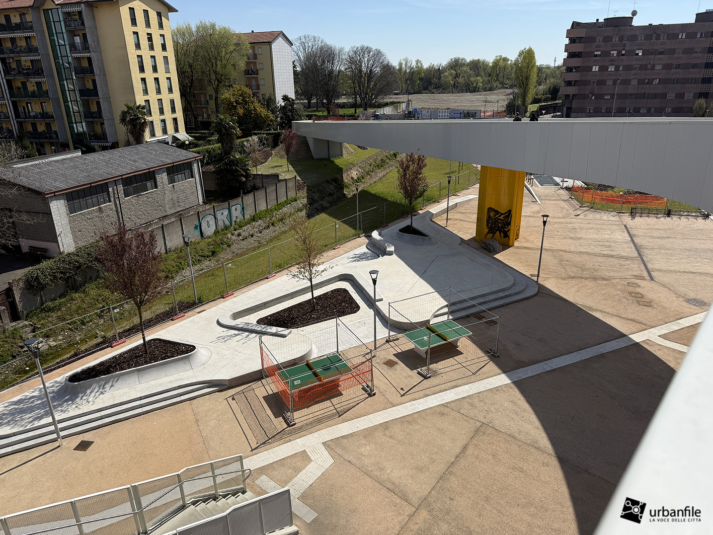 La parte centrale della passerella sorvola via Lodovico il Moro, il Naviglio Grande, l’entrata alla stazione M4 e la ferrovia. Quest’area dovrebbe comprendere un giardino, ma al momento è ancora in allestiemnto.
