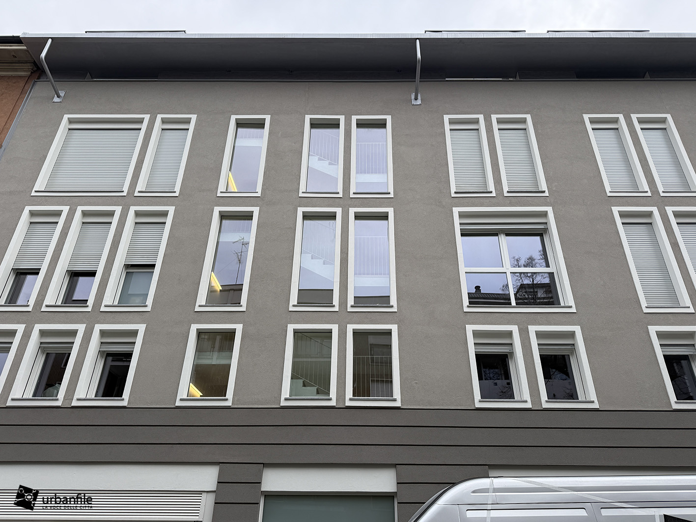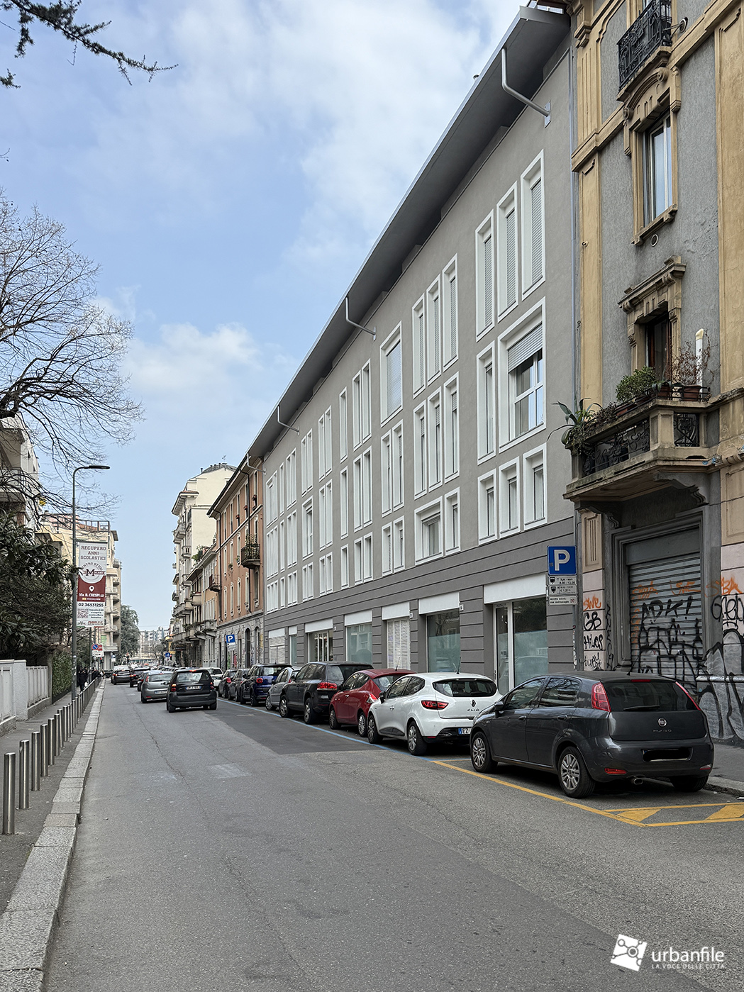 Il prospetto principale si inserisce con equilibrio nel contesto: da un lato riprende l’allineamento orizzontale delle linee di gronda e dei basamenti degli edifici adiacenti, dall’altro dialoga con il ritmo verticale tipico dell’edilizia residenziale storica del quartiere.