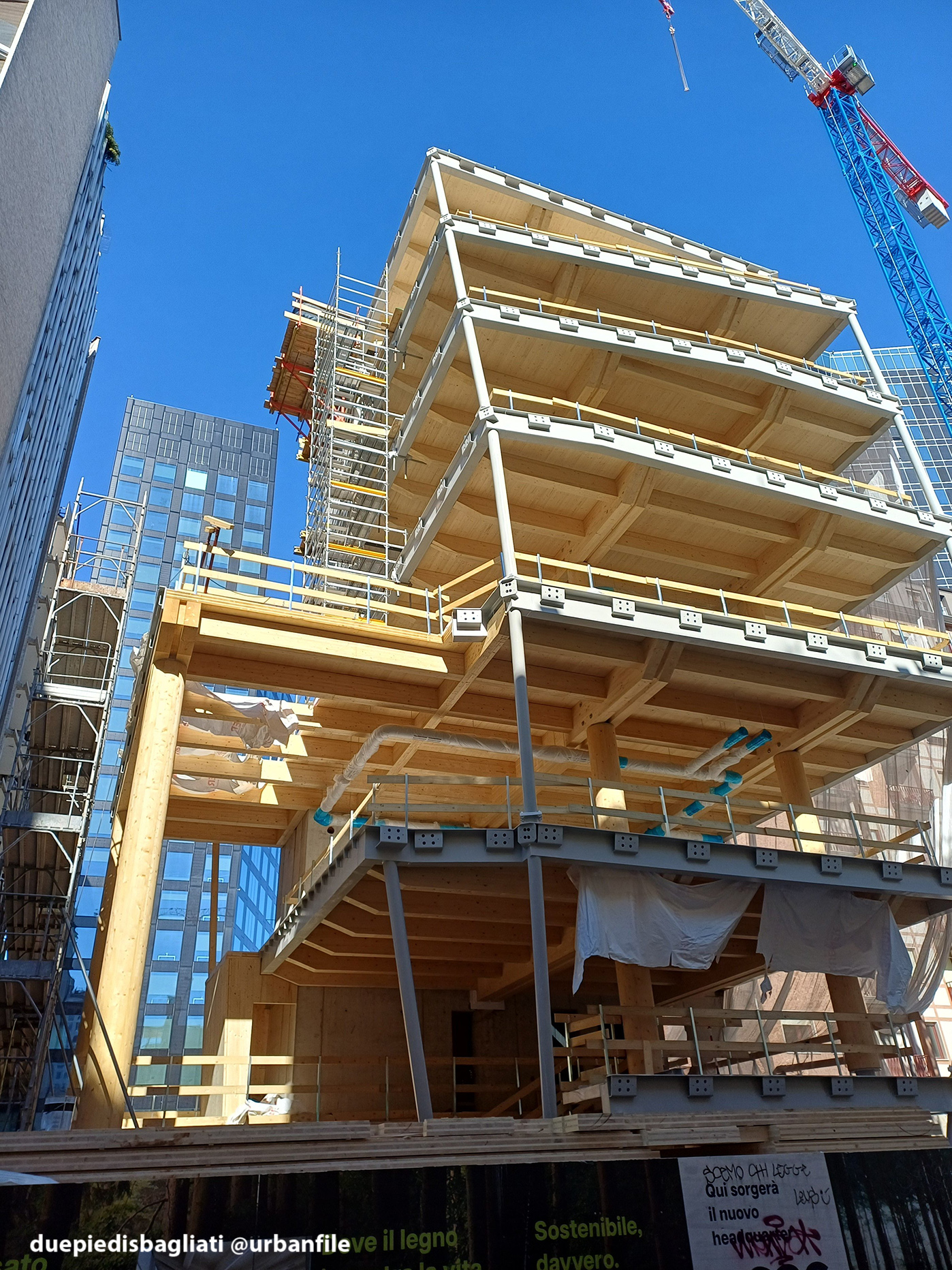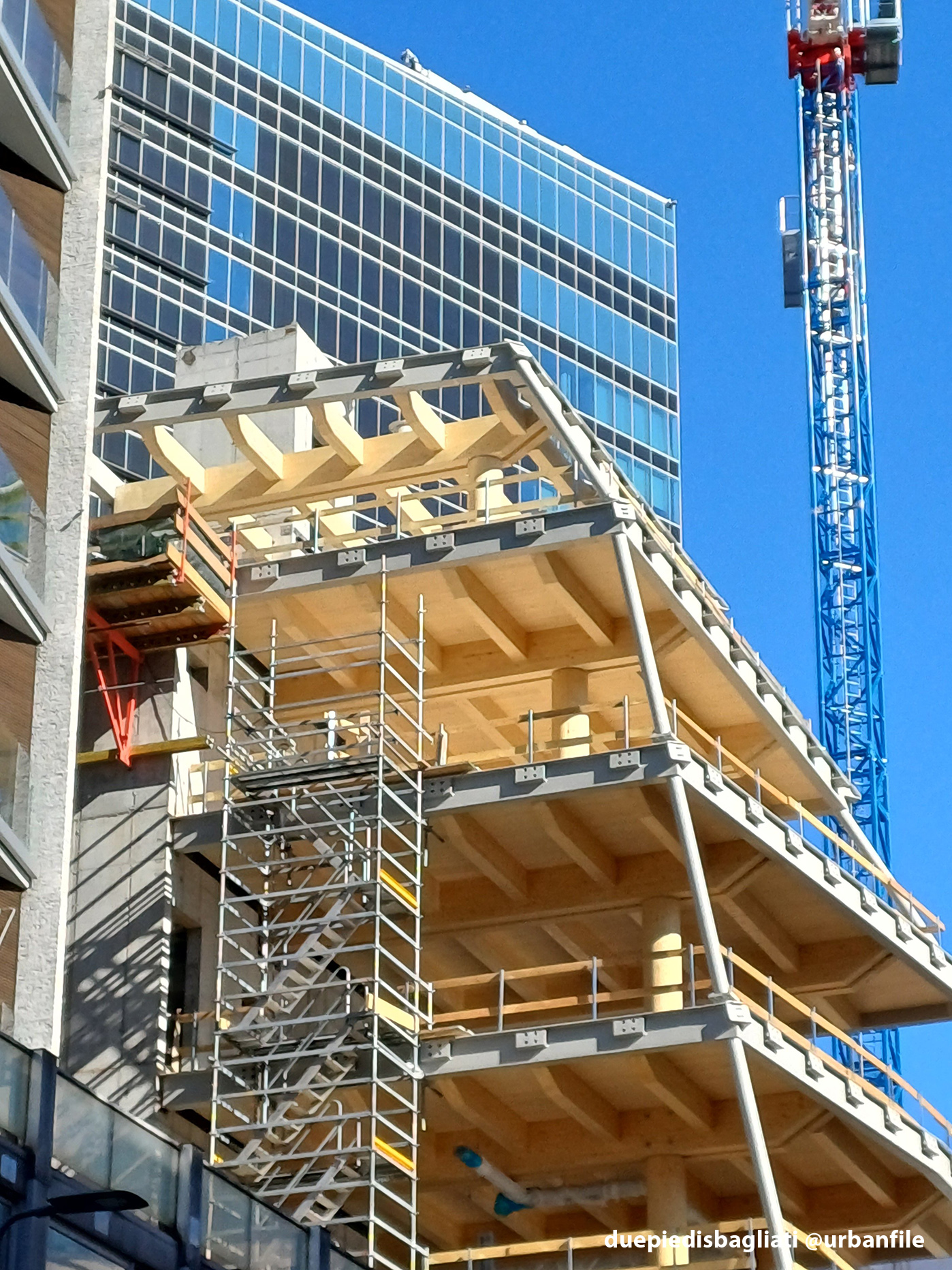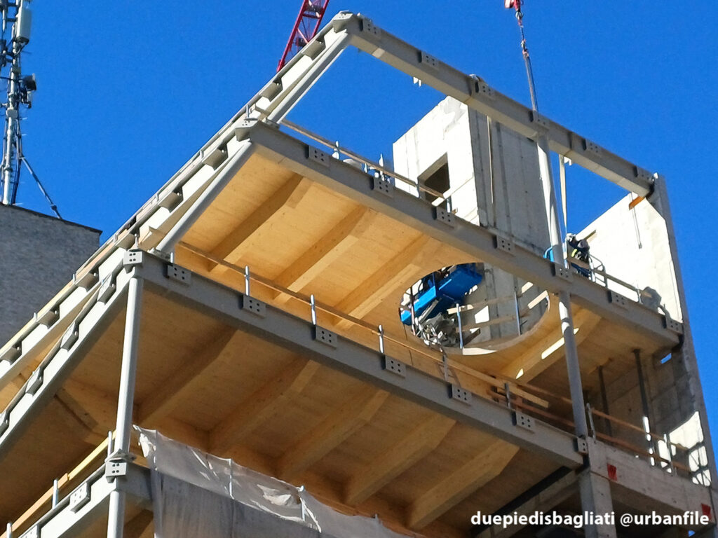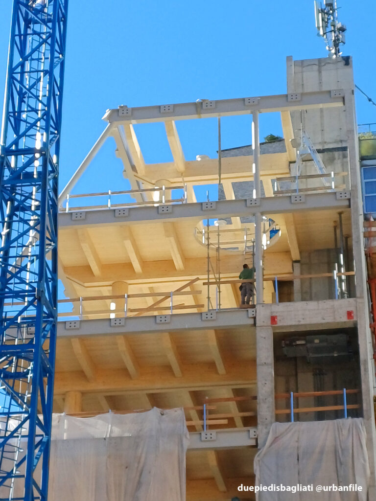La “salita” del piccolo “core” del nuovo edificio è giunta al massimo livello da qualche settimana. Col montaggio delle solette in legno dei piani e delle strutture portanti sono arrivati al settimo livello.