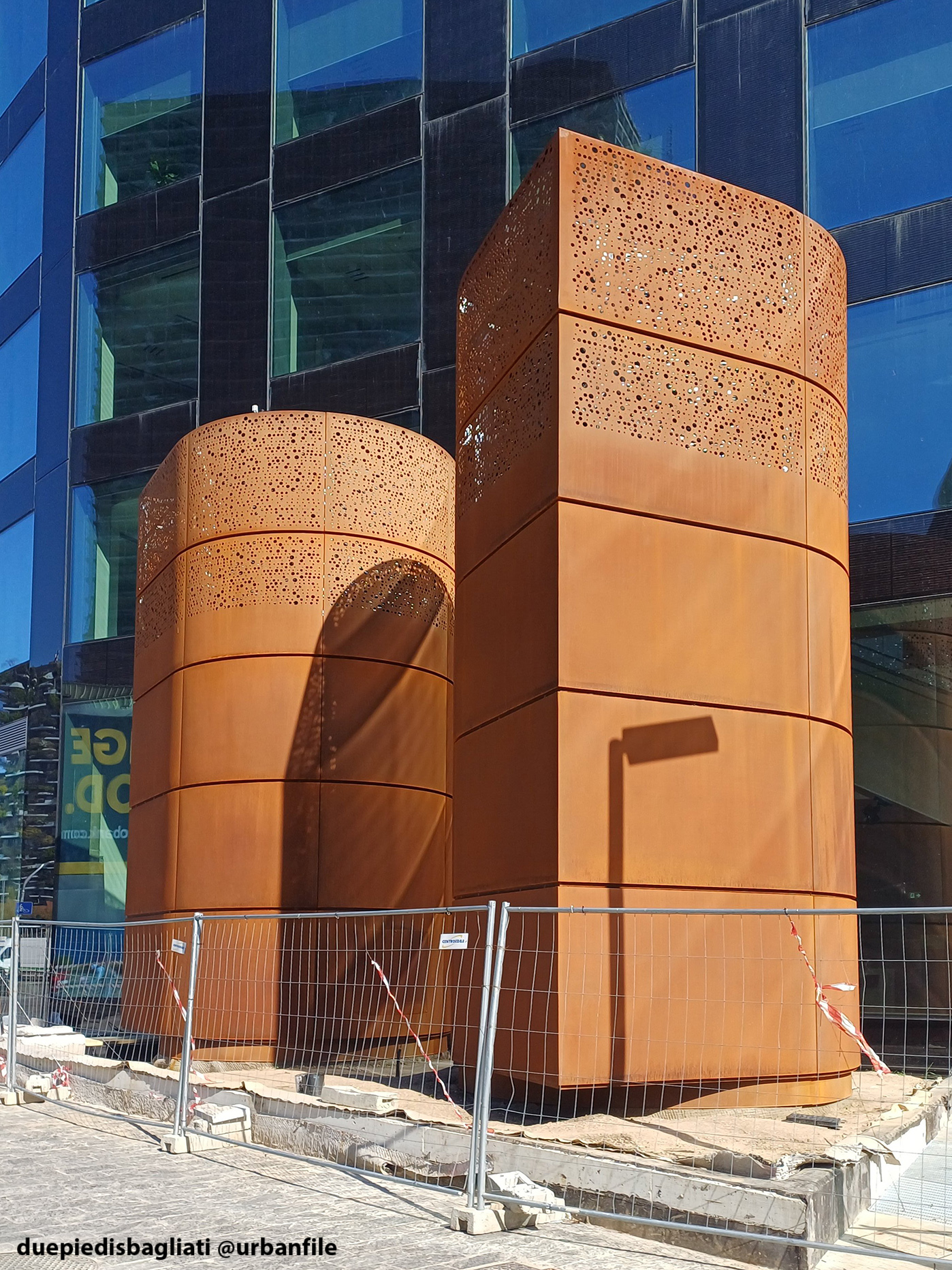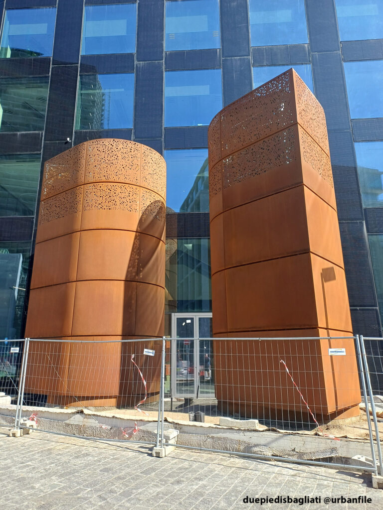 Possiamo ora dire che l’intervento per rivestire e “camuffare” i due totem per le ventole tecniche di aerazione ai lati della facciata principale è stato completato. Infatti, dopo il montaggio delle strutture metalliche, sono state montate le lastre del rivestimento in corten che trasforma le strutture tecniche in “opere d’arte”.