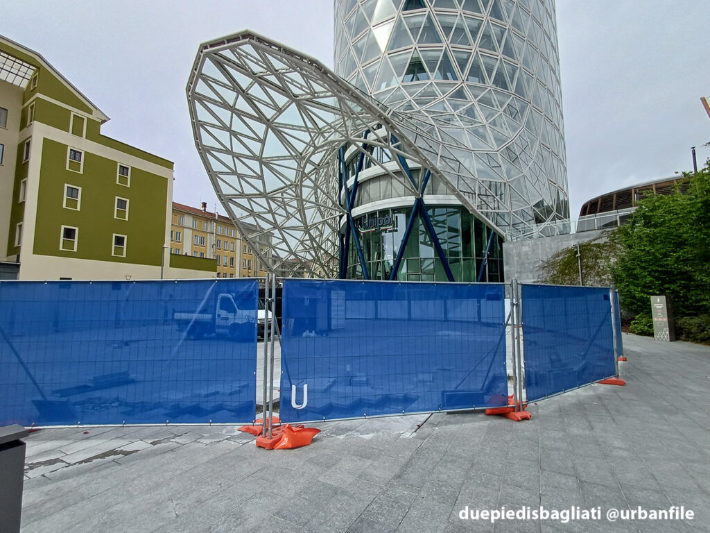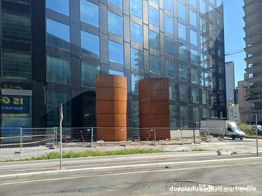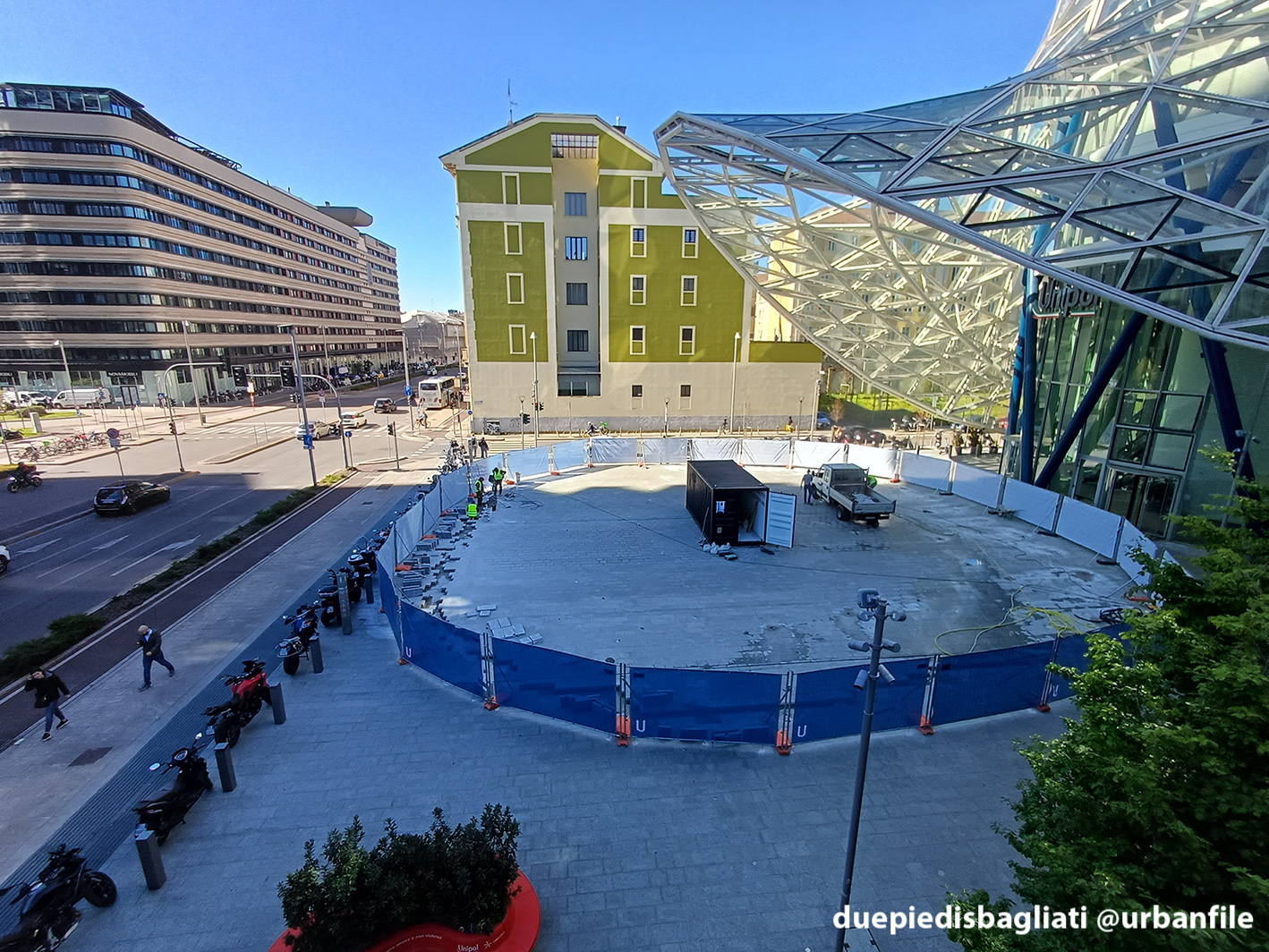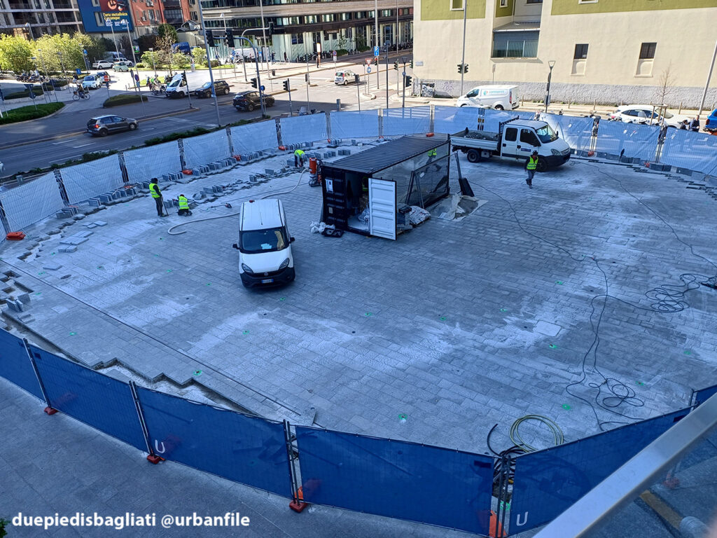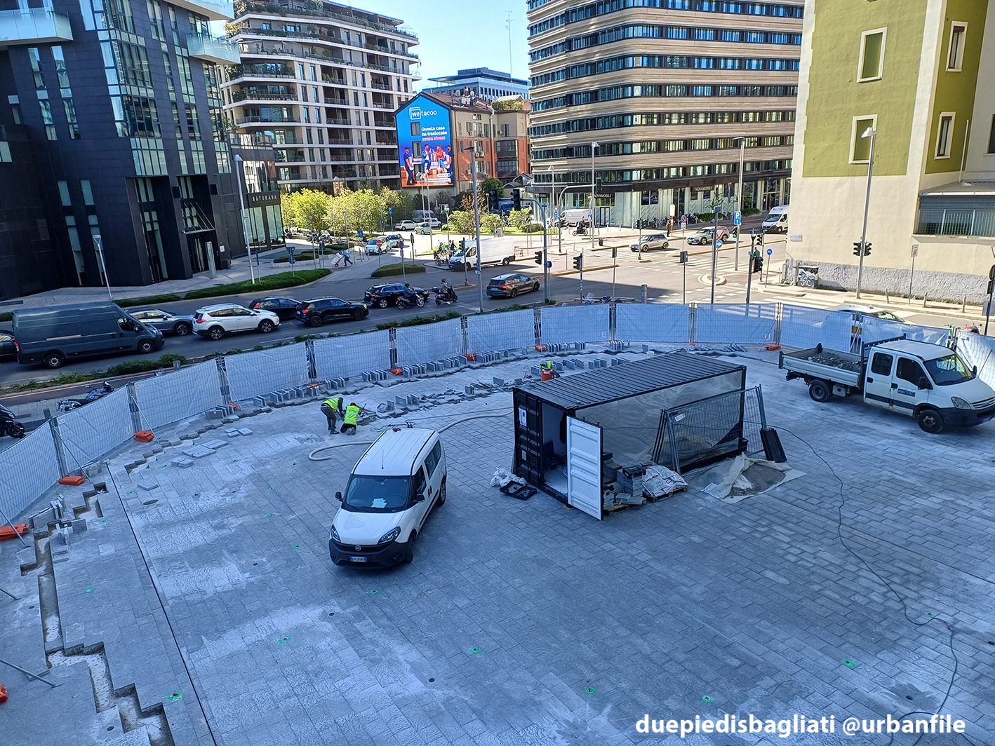 Cominciamo da l’unica grande novità, ancora misteriosa a dire il vero, in fase di realizzazione nella piazzetta antistante l’ingresso scenografico della Torre Unipol Sai, sita tra via Melchiorre Gioia e via Fratelli Castiglioni. Da qualche giorno sono in corso degli interventi alla pavimentazione della piazza, dove tecnici stanno asportando file di piastrelle seguendo un disegno circolare. Non siamo ancora riusciti a scoprire il perché, forse qualche istallazione artistica?