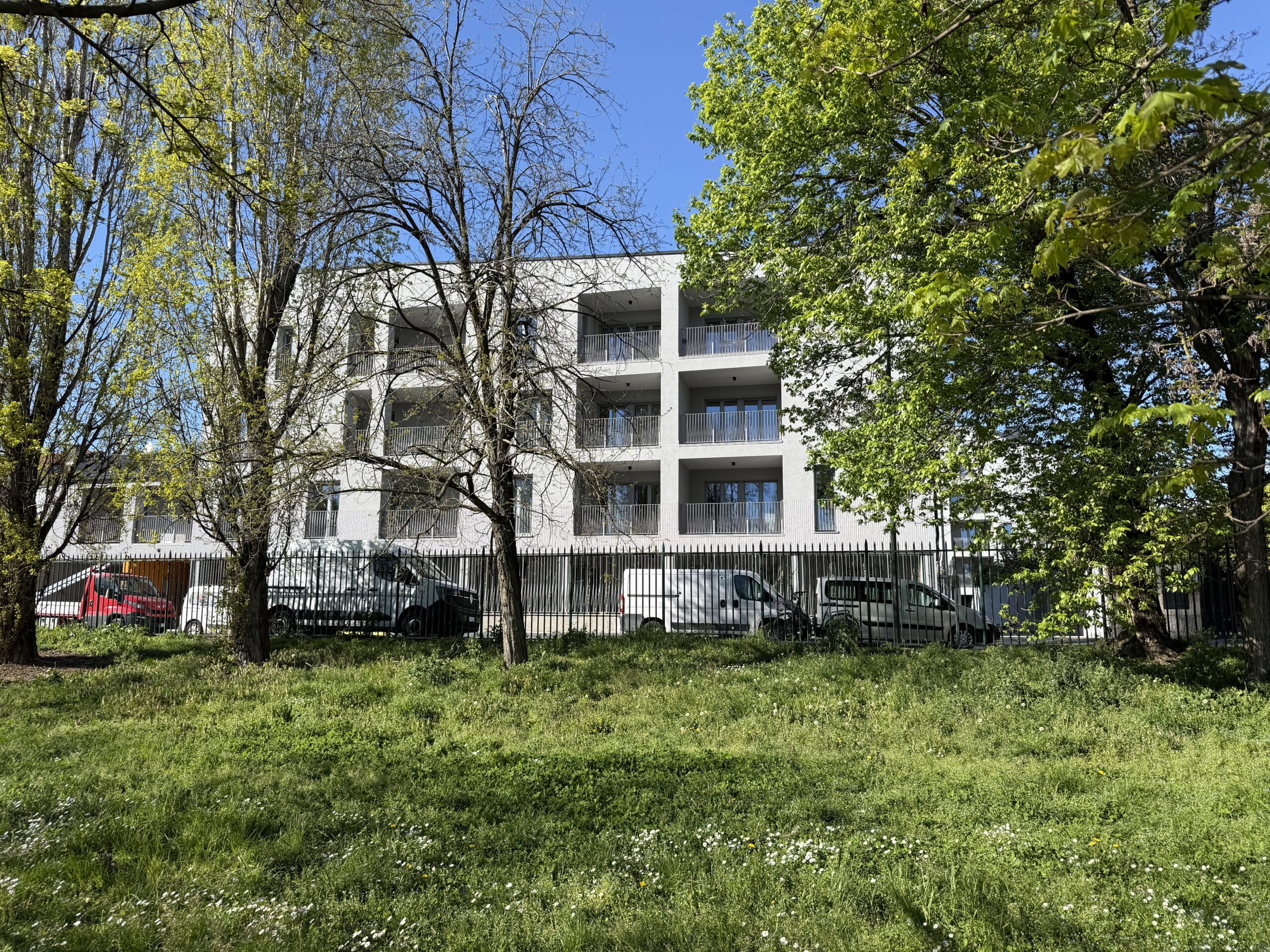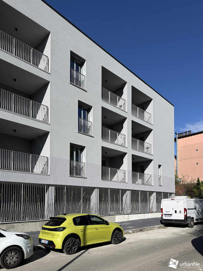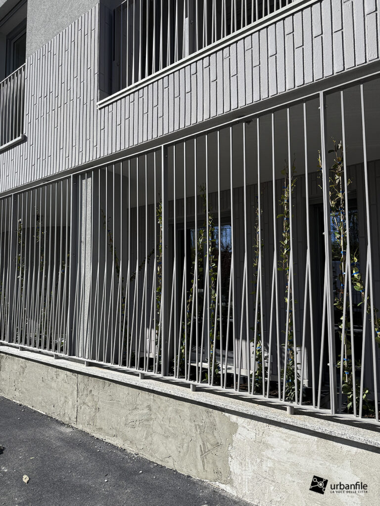 Le facciate, sobrie ed eleganti, sono realizzate in intonaco color grigio ghiaccio, una tonalità tenue che dialoga con l’ambiente urbano. Il prospetto è scandito dal ritmo delle logge e delle finestre a tutta altezza, che conferiscono leggerezza e verticalità all’insieme. Particolare cura è stata dedicata agli elementi metallici: le ringhiere dei balconi e del portico al piano terra si distinguono per un interessante gioco plastico di bacchette intrecciate, capace di animare e valorizzare un elemento altrimenti funzionale.