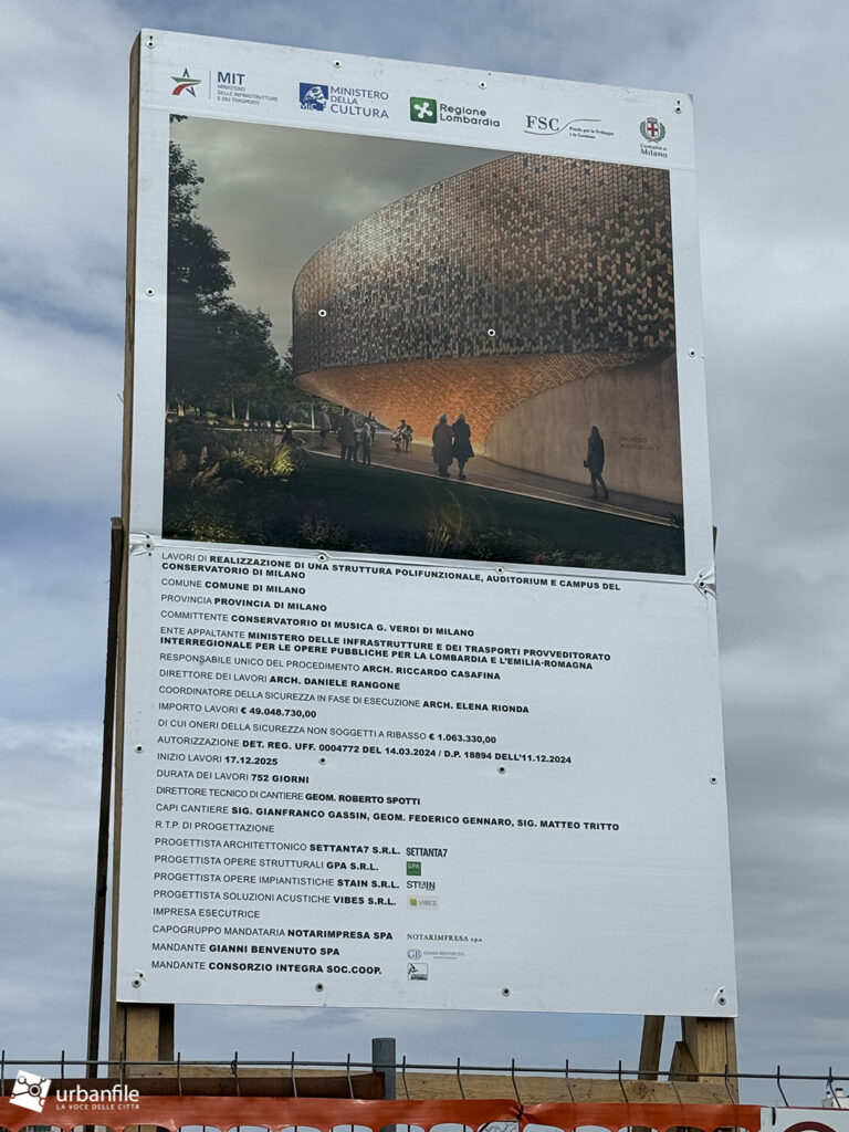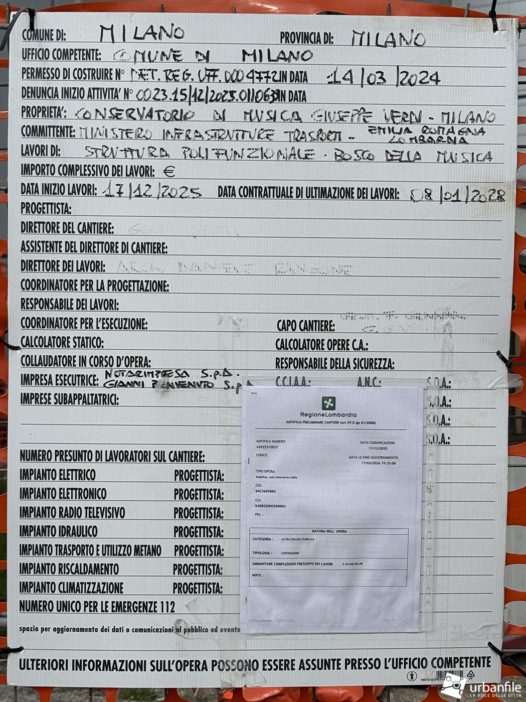 Aprile 2026. Aggiornamento dal cantiere del “Bosco della Musica“ di Rogoredo, il nuovo campus del Conservatorio di Musica Giuseppe Verdi di Milano (presentato nel 2022), in fase di realizzazione tra via Rogoredo, via Monte Penice e via Francesco Pizzolpasso. Nei giorni precedenti al Natale sono iniziati i lavori preliminari di allestimento del cantiere, con la rimozione degli arbusti cresciuti spontaneamente in attesa dell’avvio degli interventi.