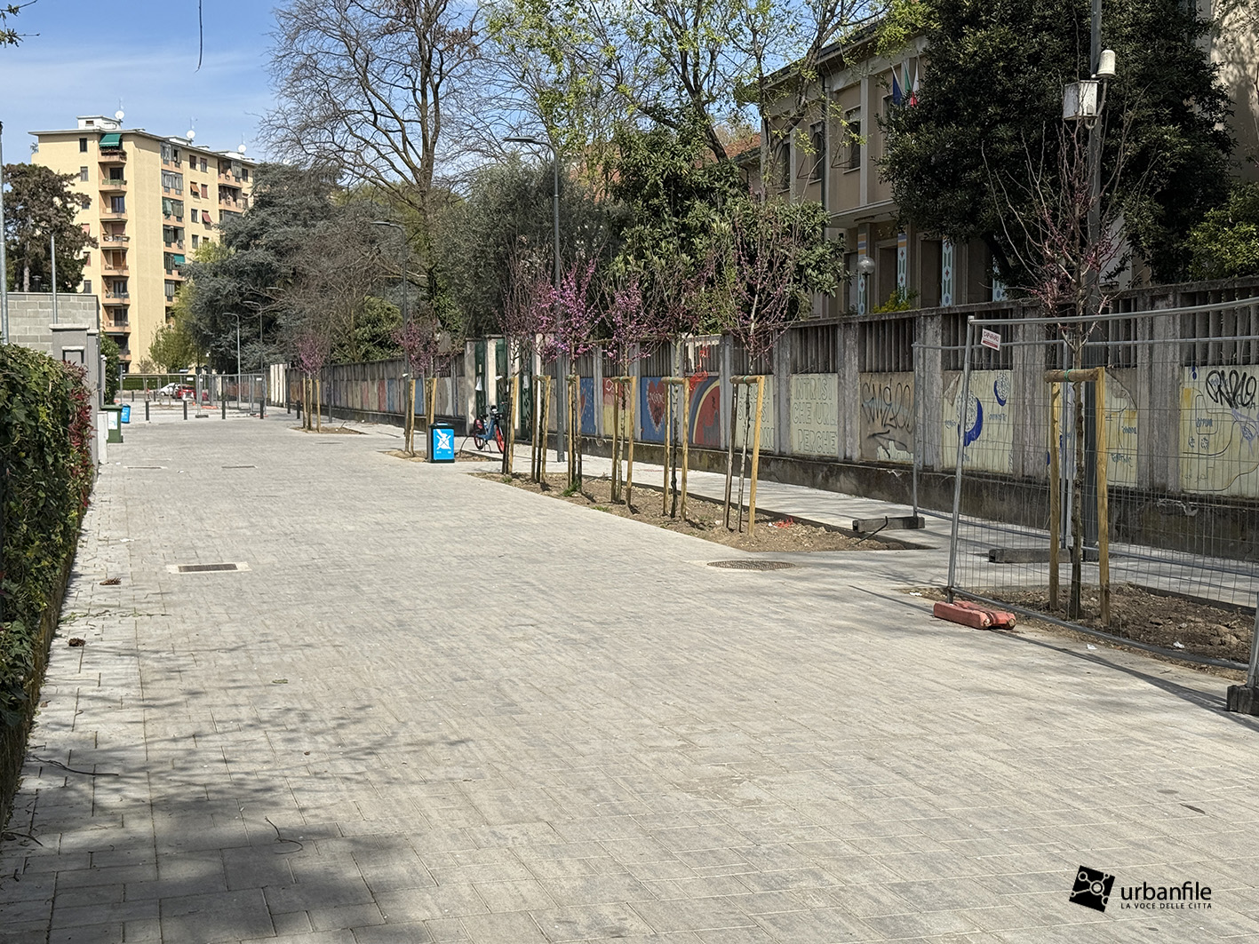Via dei Narcisi davanti al plesso scolastico è stata definita e sono arrivate anche le alberature.