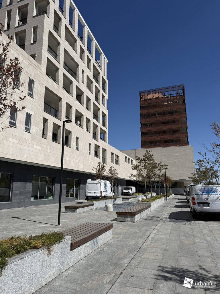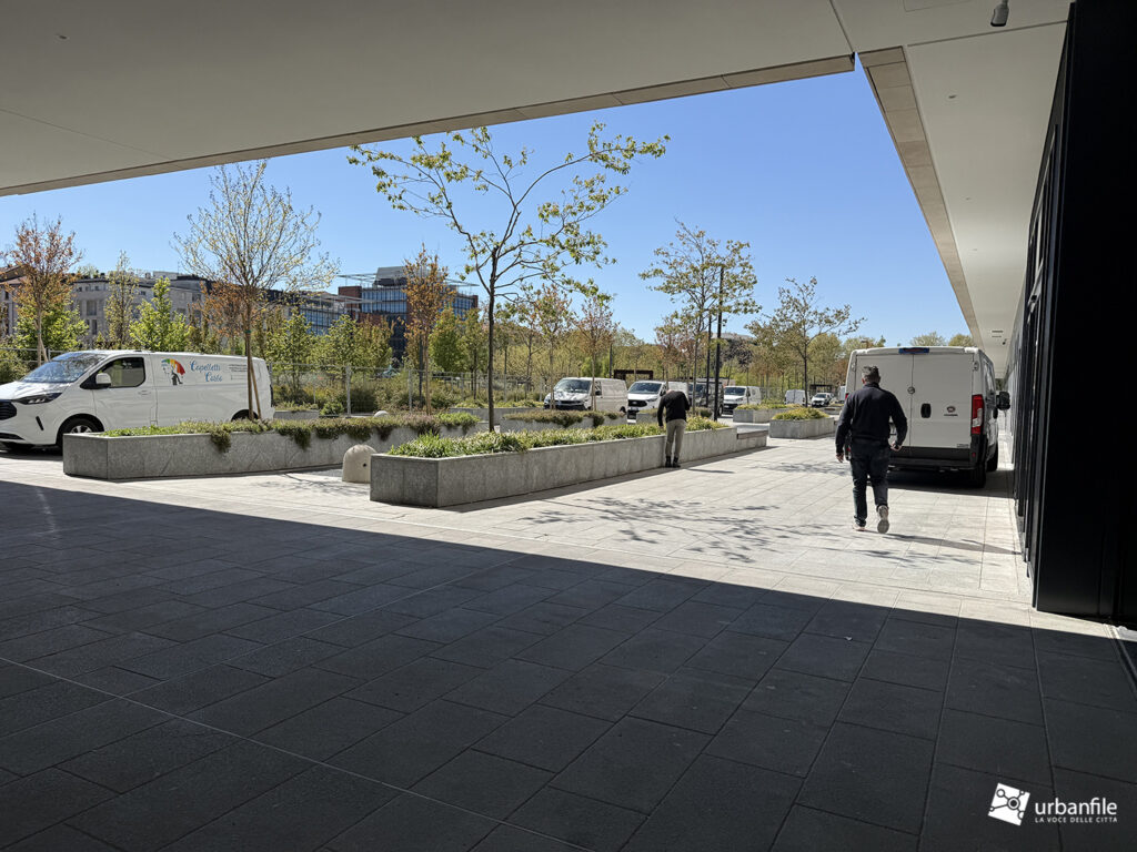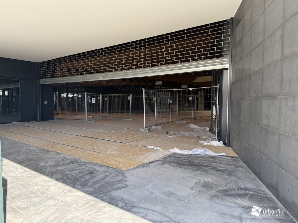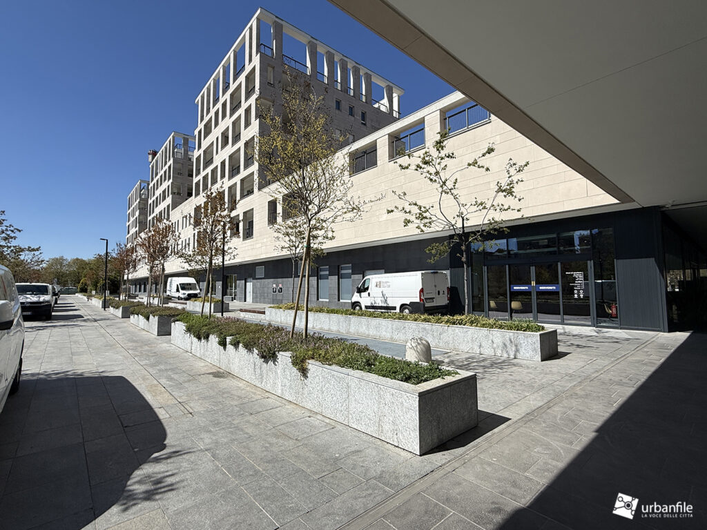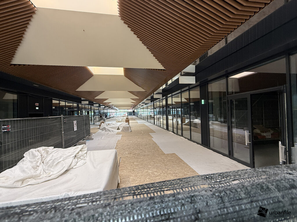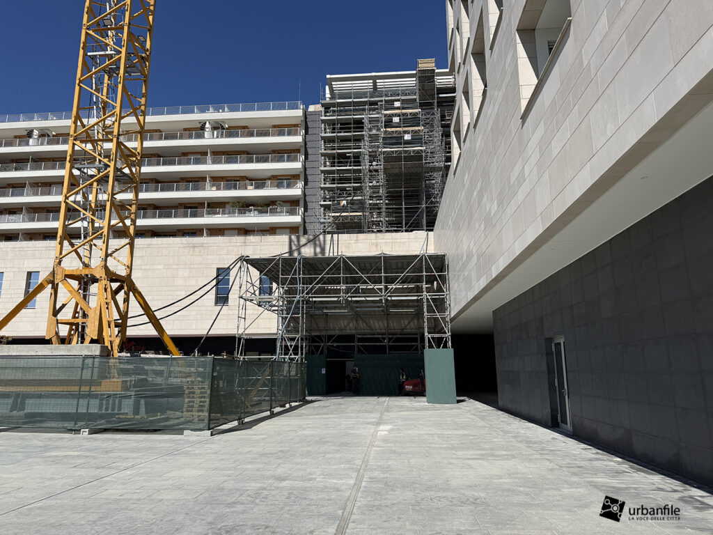 Il resto dell’area in cantiere è la seguente: aree comuni e percorsi pedonali ancora da ultimare, così come il cantiere dell’Hotel. Collegamento con viale Umbria aperto.