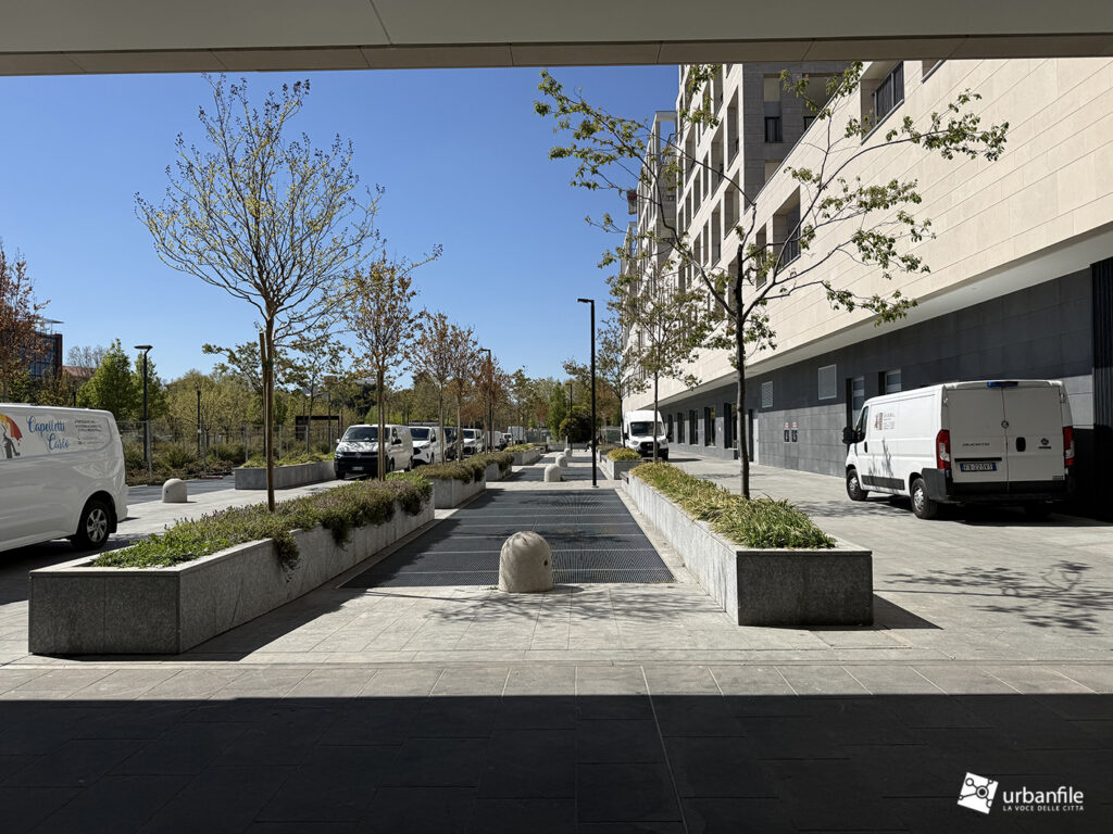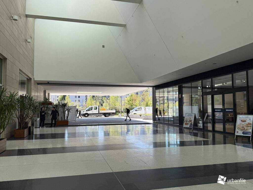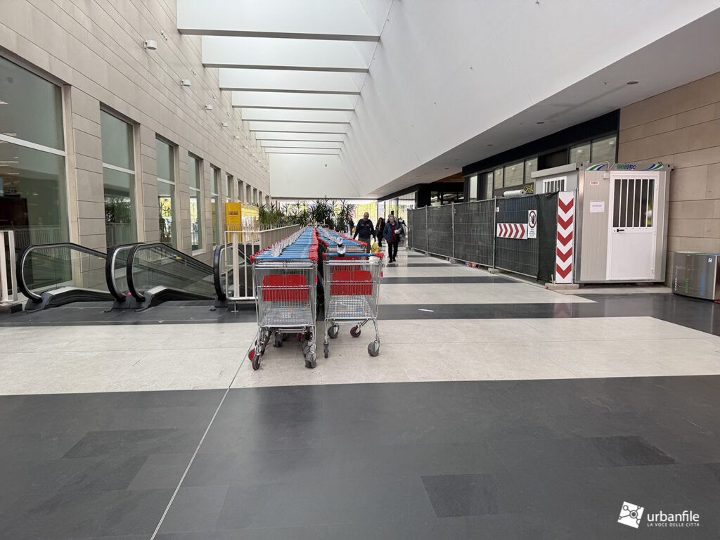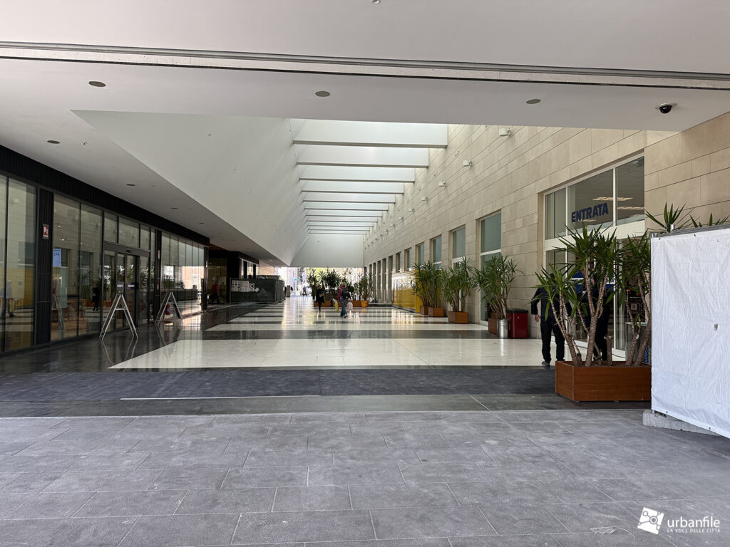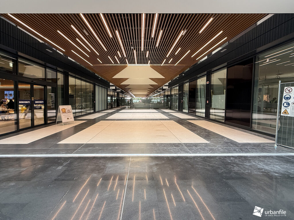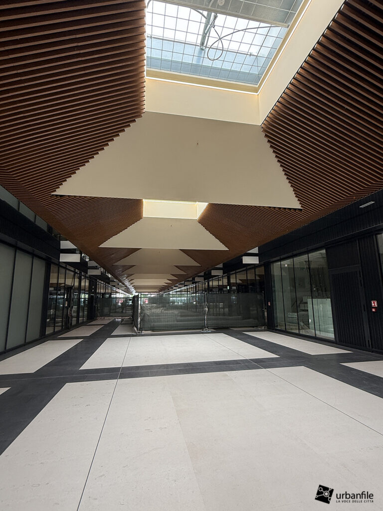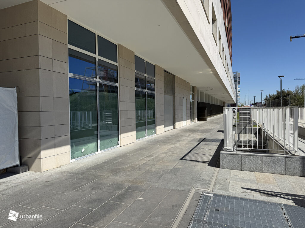 Il resto dell’area in cantiere è la seguente: aree comuni e percorsi pedonali ancora da ultimare, così come il cantiere dell’Hotel. Collegamento con viale Umbria aperto.