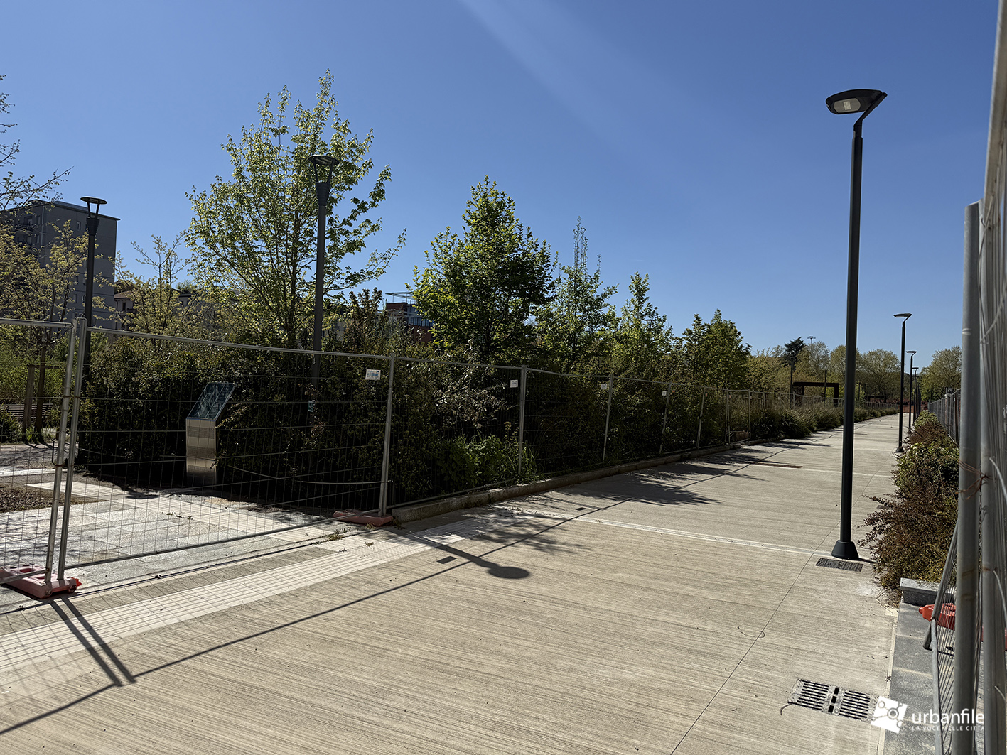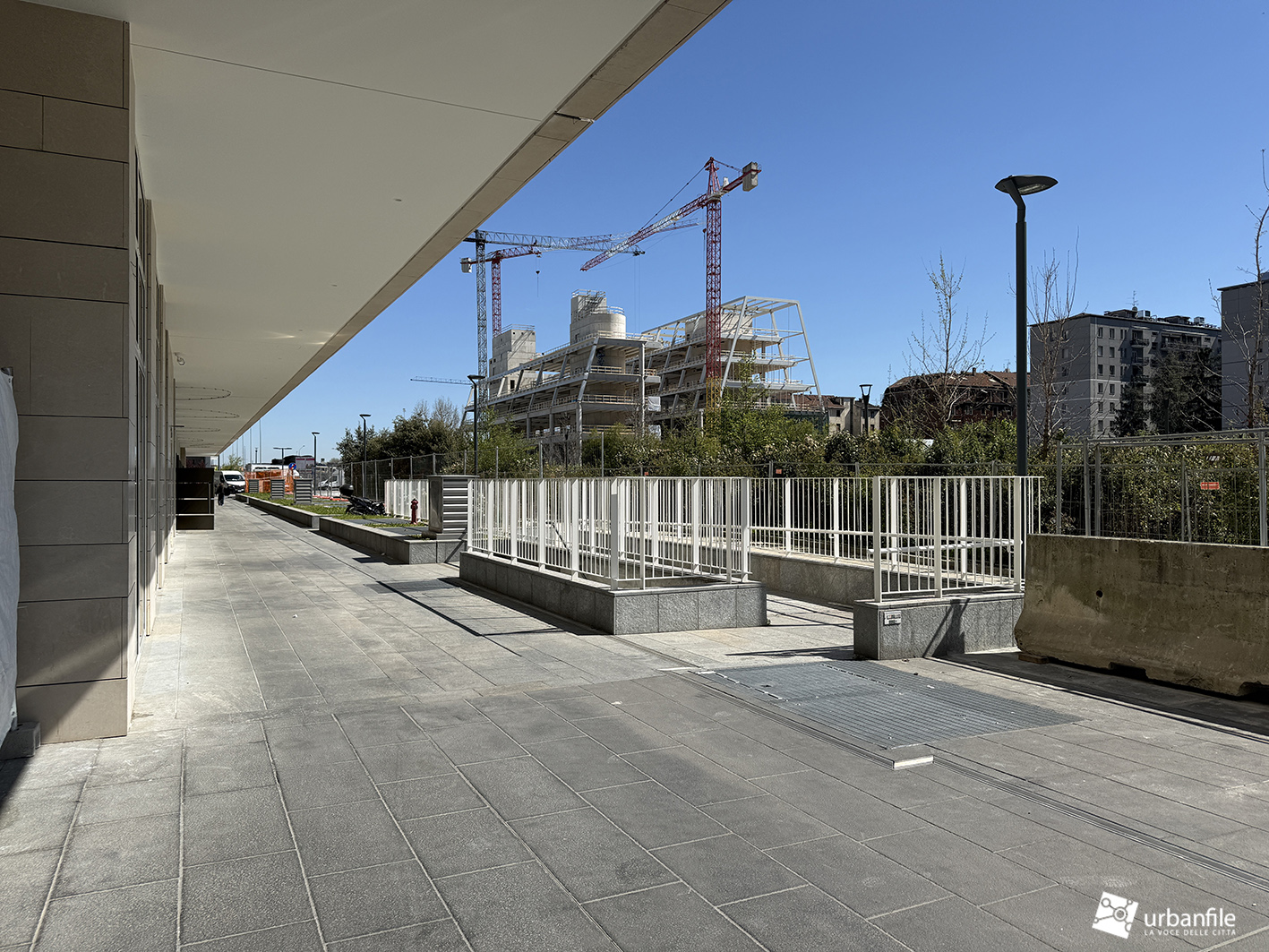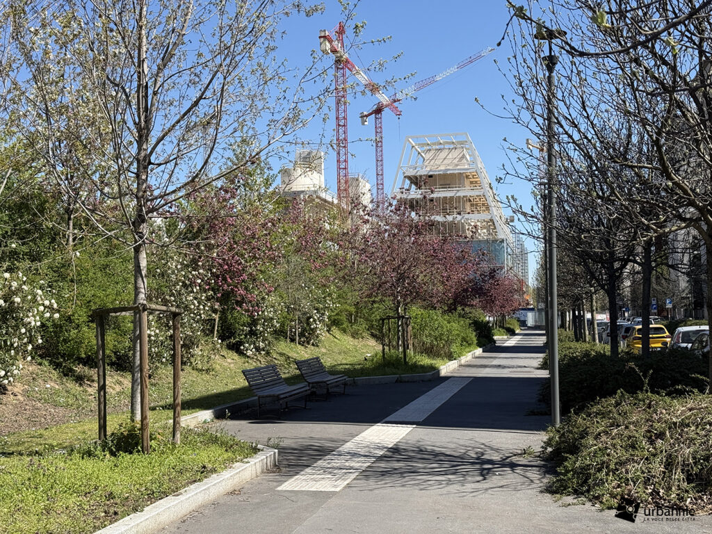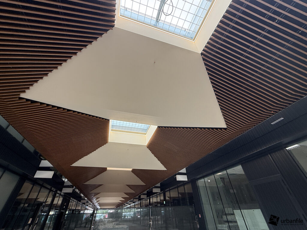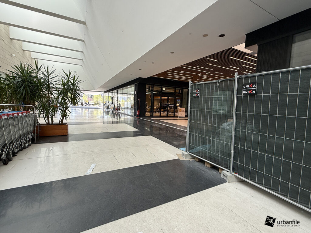 Il resto dell’area in cantiere è la seguente: aree comuni e percorsi pedonali ancora da ultimare, così come il cantiere dell’Hotel. Collegamento con viale Umbria aperto.