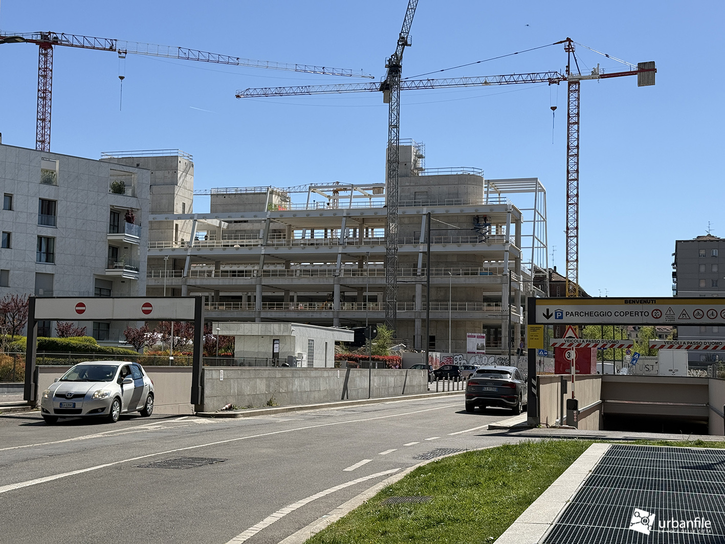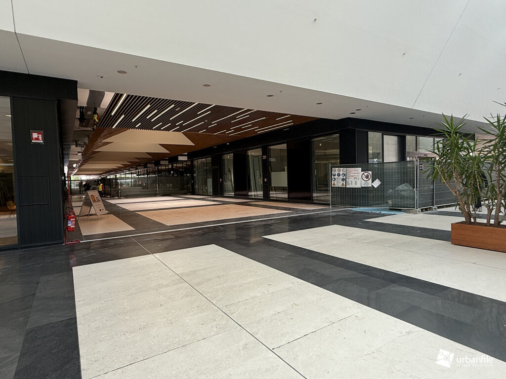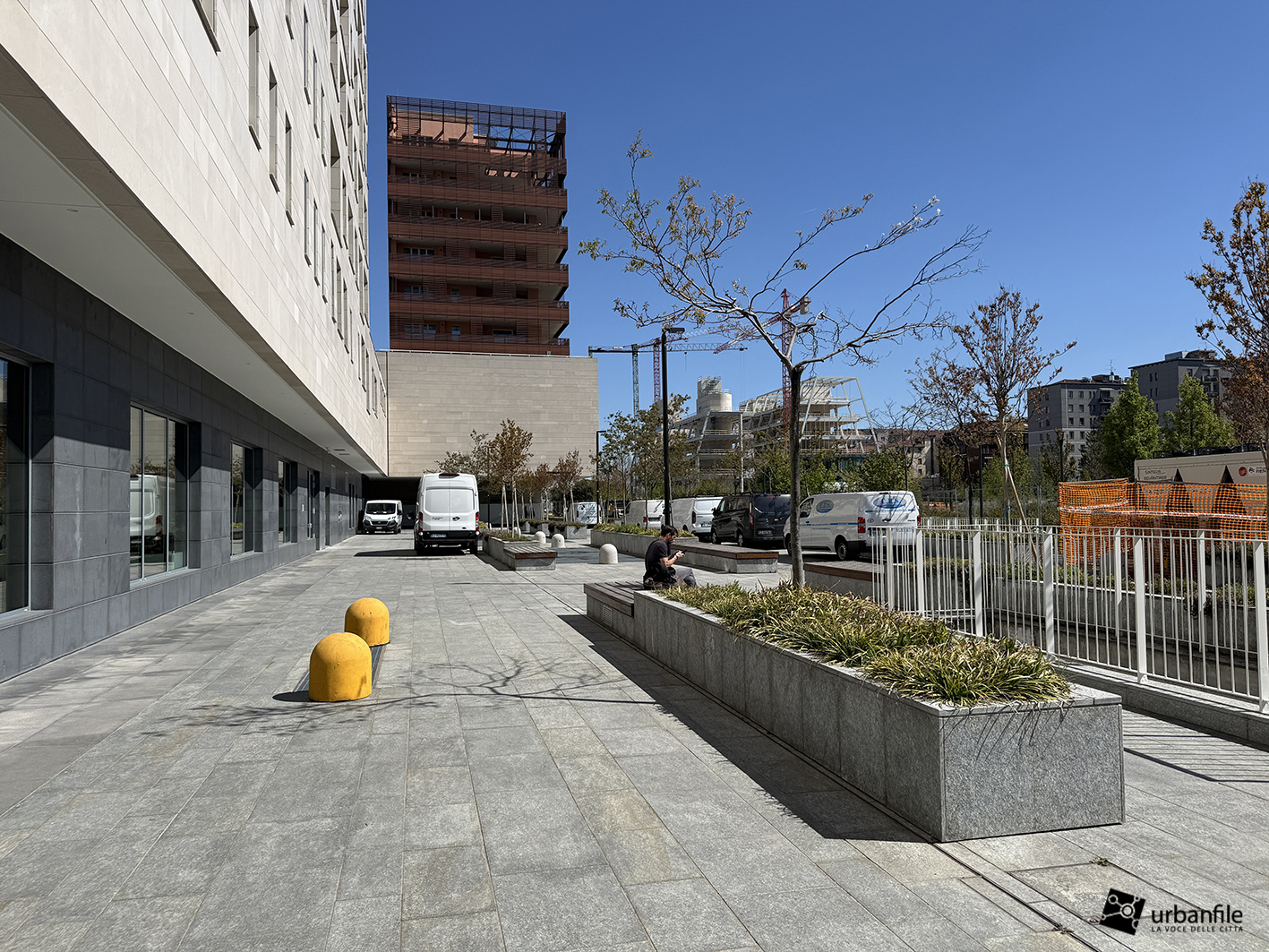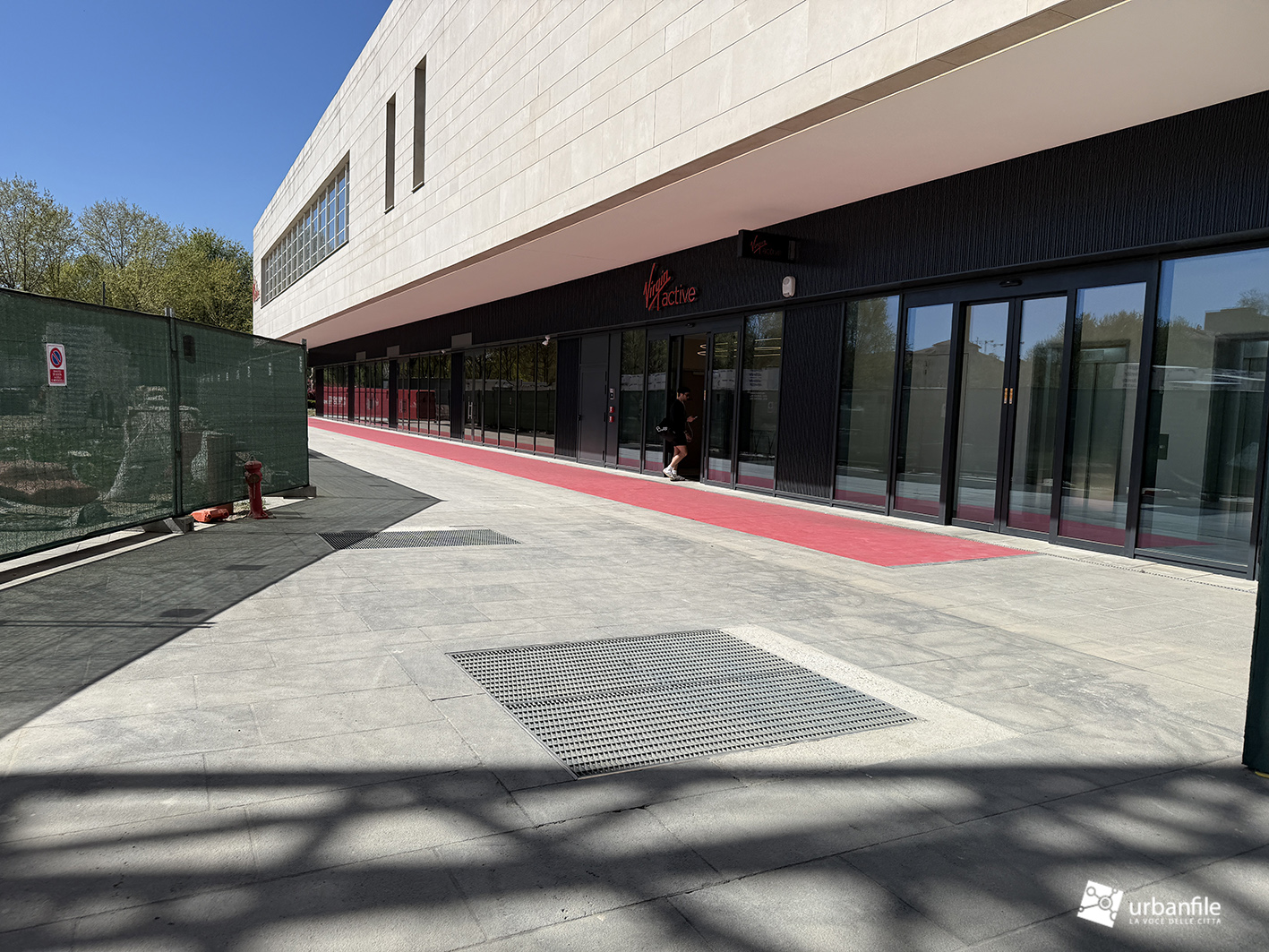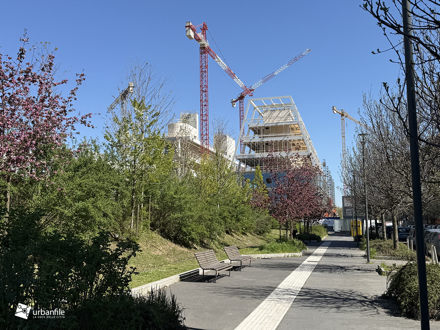 Il resto dell’area in cantiere è la seguente: aree comuni e percorsi pedonali ancora da ultimare, così come il cantiere dell’Hotel. Collegamento con viale Umbria aperto.