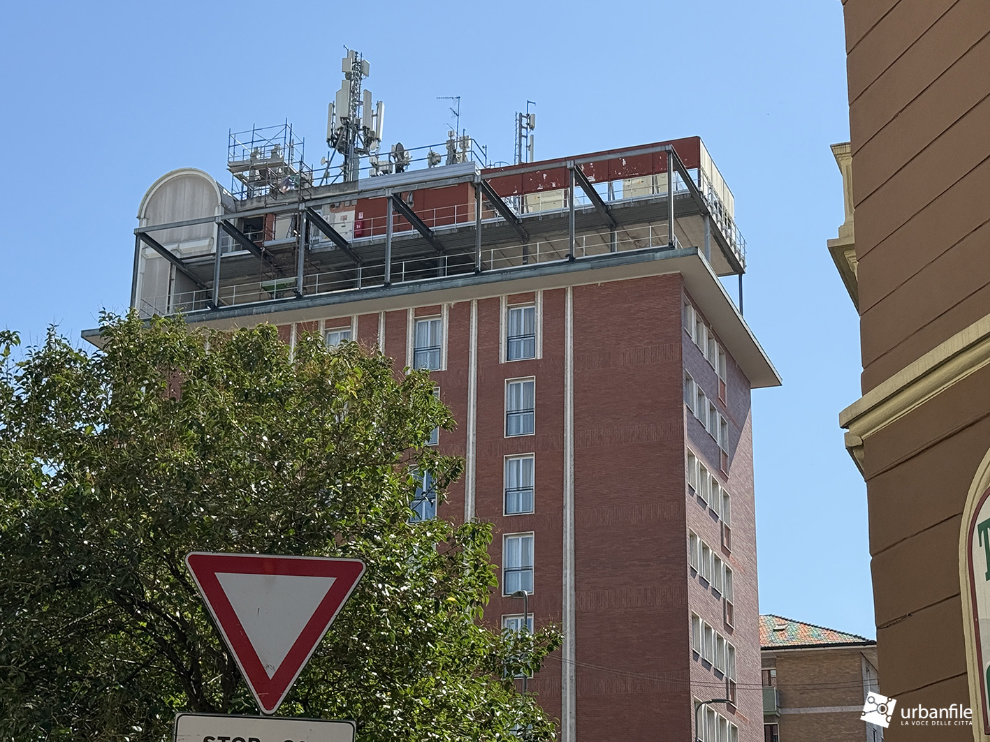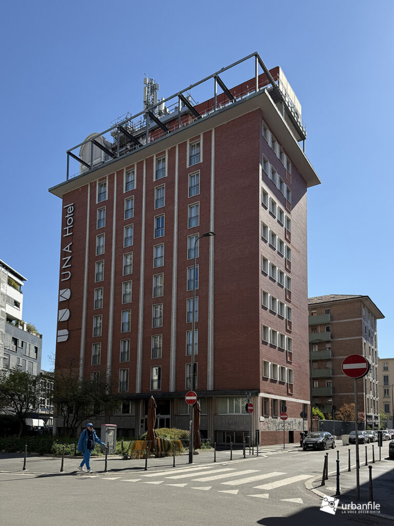 L’incompiuto sopralzo ormai più che trentennale ogni volta che lo sguardo lo cattura, ci viene da chiederci se mai verrà completato. Siamo all’incrocio con Via Bernardino Corio, Via Colletta Pietro e Via Ludovico Muratori (14), dove l’hotel UNA, ormai decenni fa – non vorrei sbagliare, ma credo in occasione dei Mondiali di calcio del Novanta – venne rialzato di un piano con una struttura metallica e in parte in muratura. Ebbene da sempre quel sopralzo è rimasto incompiuto, un po’ uno sfregio alla città.