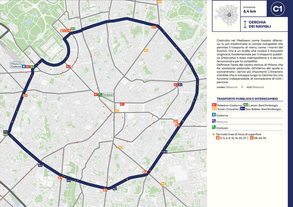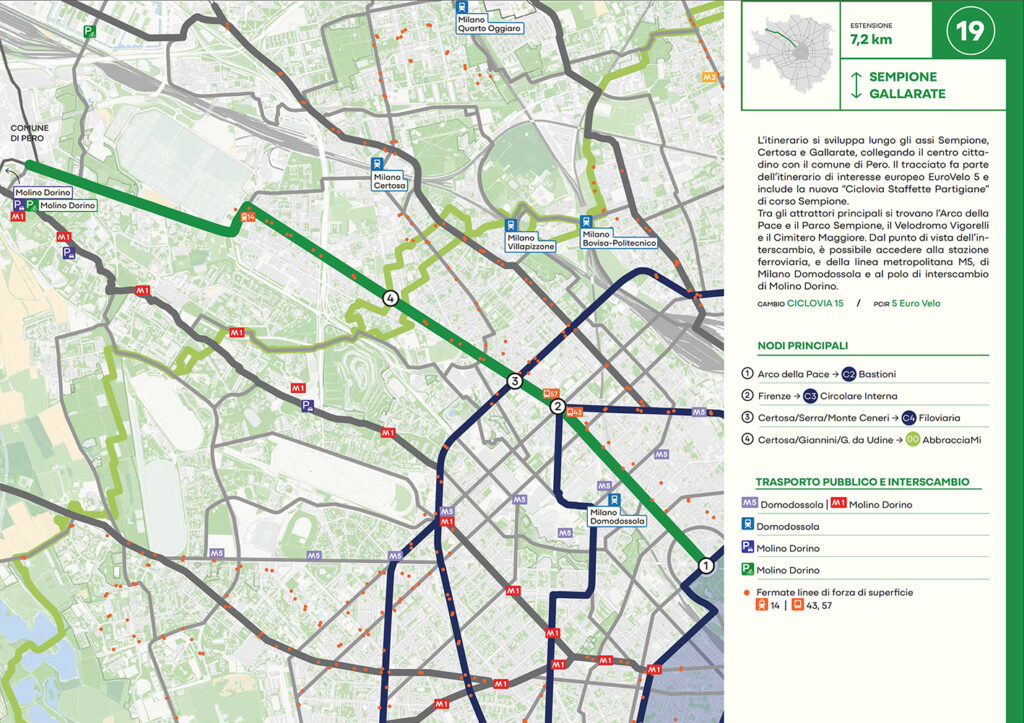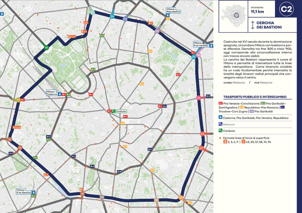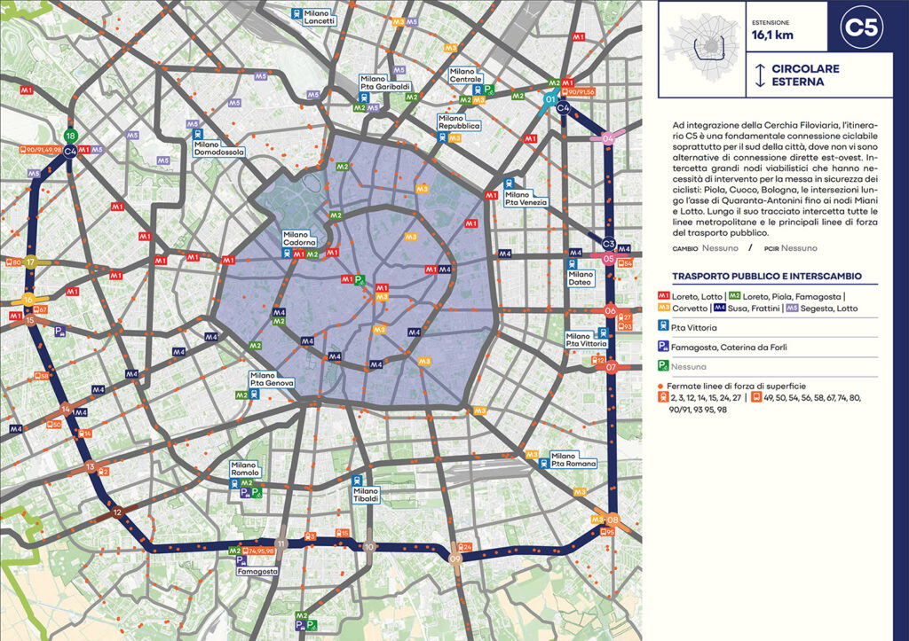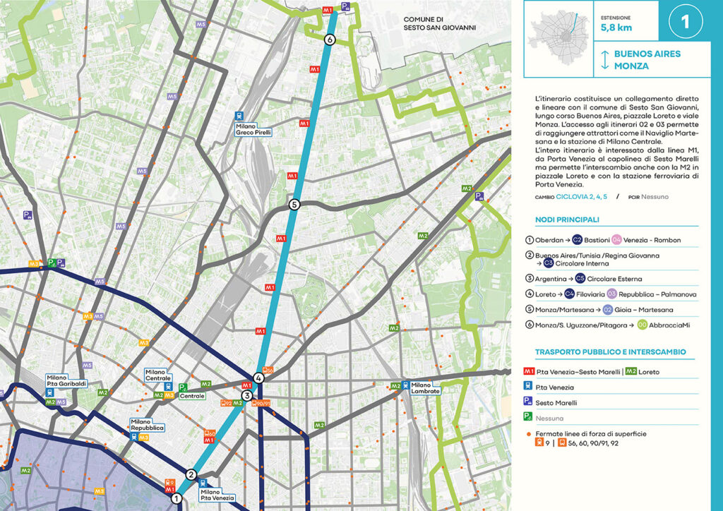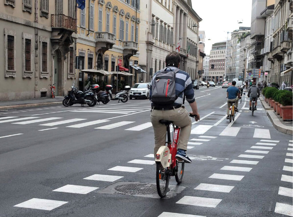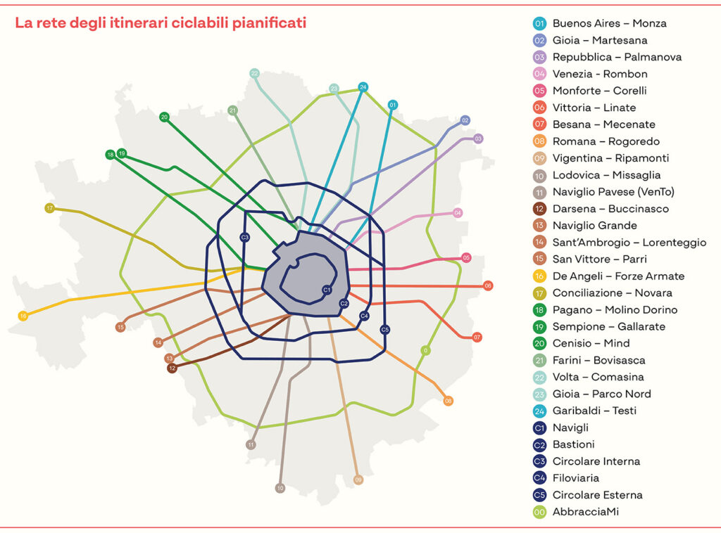 Per quanto riguarda la mobilità ciclabile, il documento prevede una rete complessiva di 565 km, articolata in 210 km di percorsi principali (suddivisi in 29 itinerari) e 355 km secondari. Attualmente è stato realizzato circa il 46% della rete principale. Alcuni tracciati strategici sono già oltre l’80% di completamento, tra cui Buenos Aires-Monza, Gioia-Martesana, Monforte-Corelli, Naviglio Pavese (VenTo), Naviglio Grande, Sempione-Gallarate e Garibaldi-Testi.