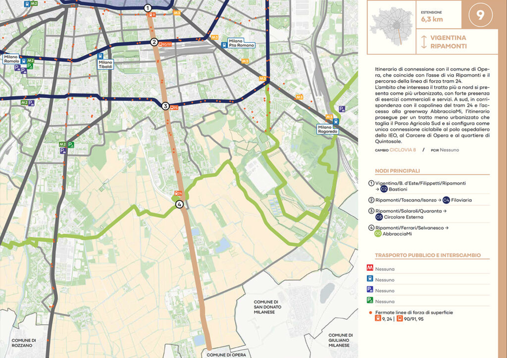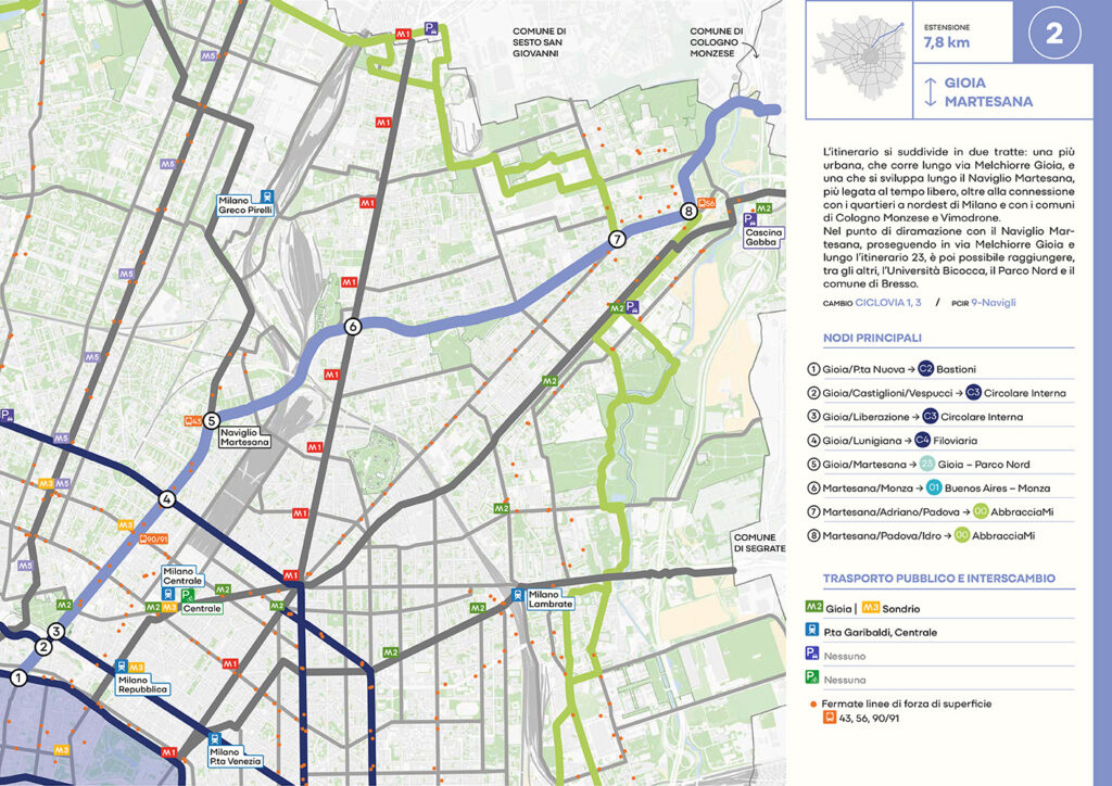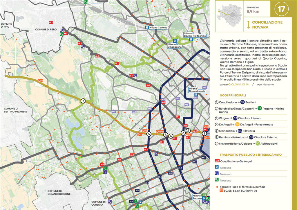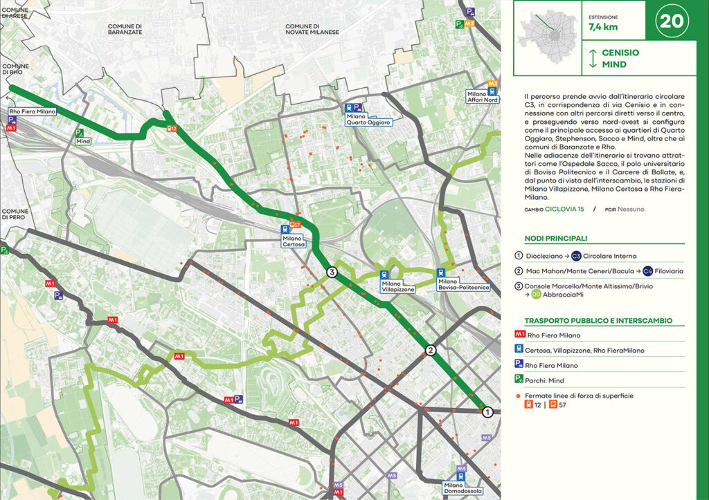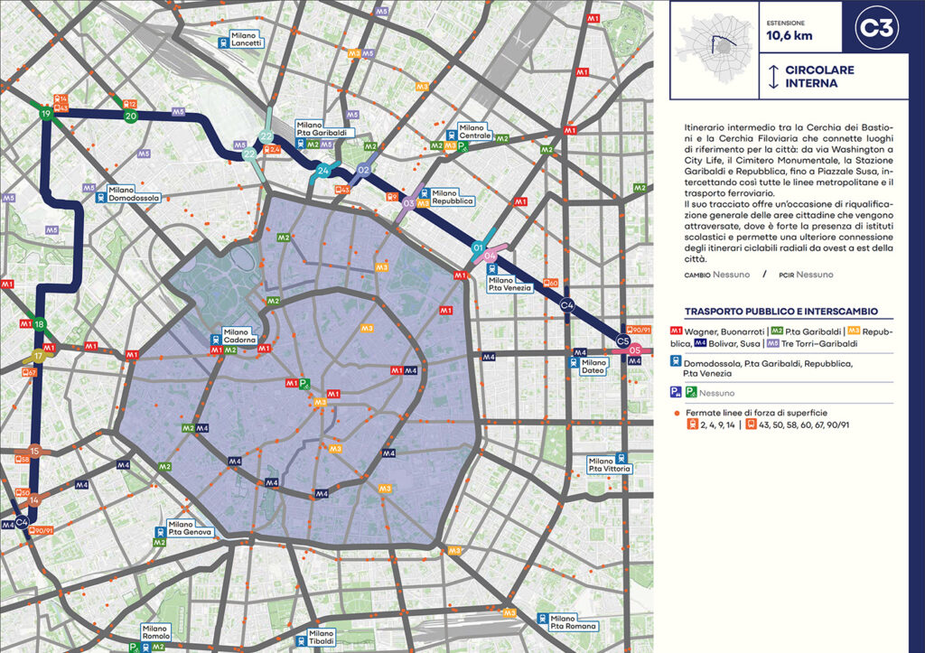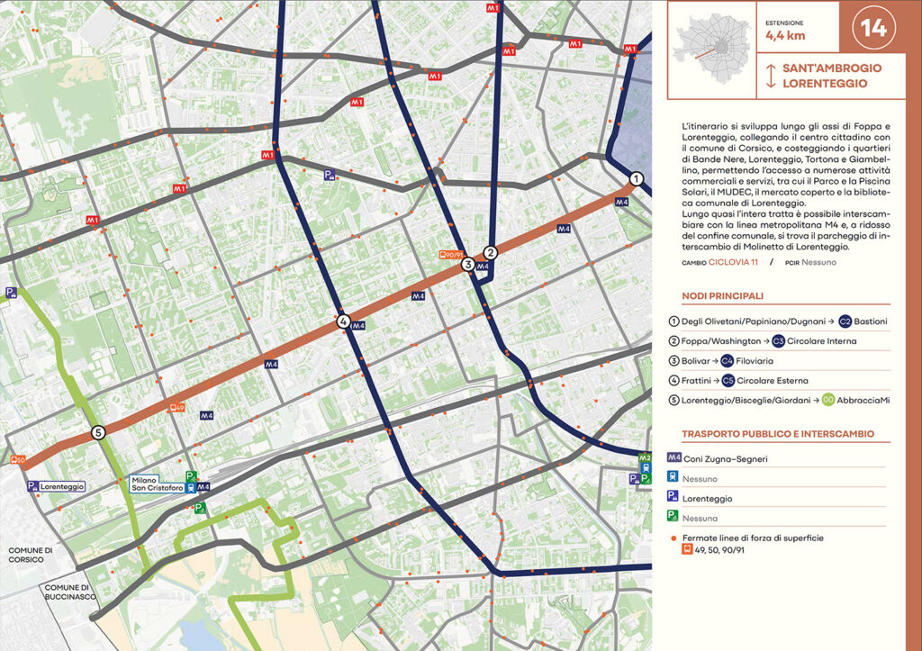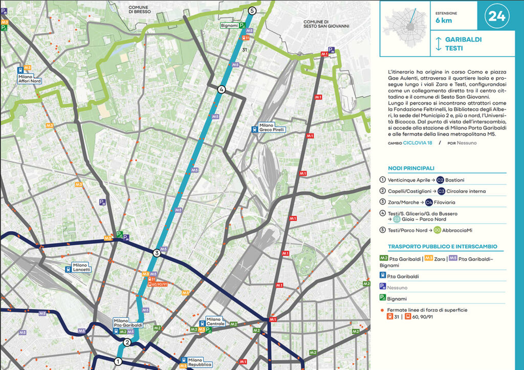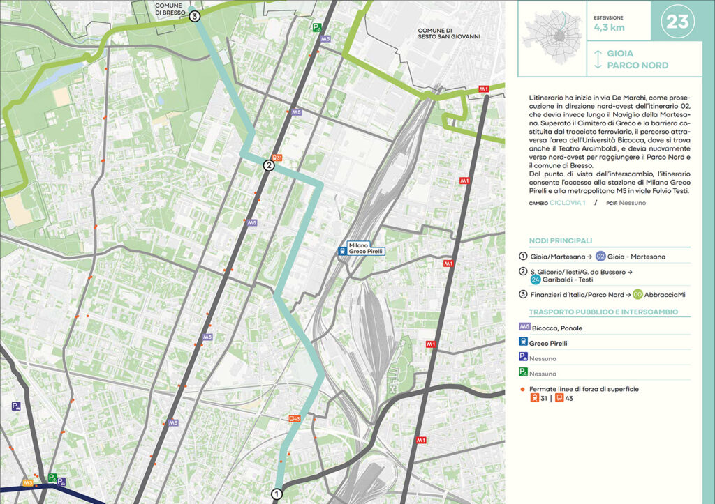 Per quanto riguarda la mobilità ciclabile, il documento prevede una rete complessiva di 565 km, articolata in 210 km di percorsi principali (suddivisi in 29 itinerari) e 355 km secondari. Attualmente è stato realizzato circa il 46% della rete principale. Alcuni tracciati strategici sono già oltre l’80% di completamento, tra cui Buenos Aires-Monza, Gioia-Martesana, Monforte-Corelli, Naviglio Pavese (VenTo), Naviglio Grande, Sempione-Gallarate e Garibaldi-Testi.