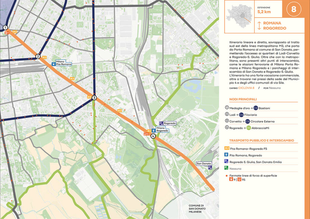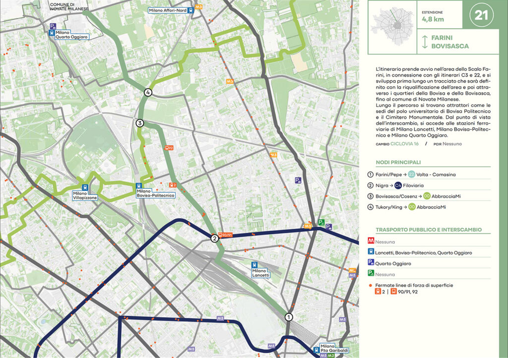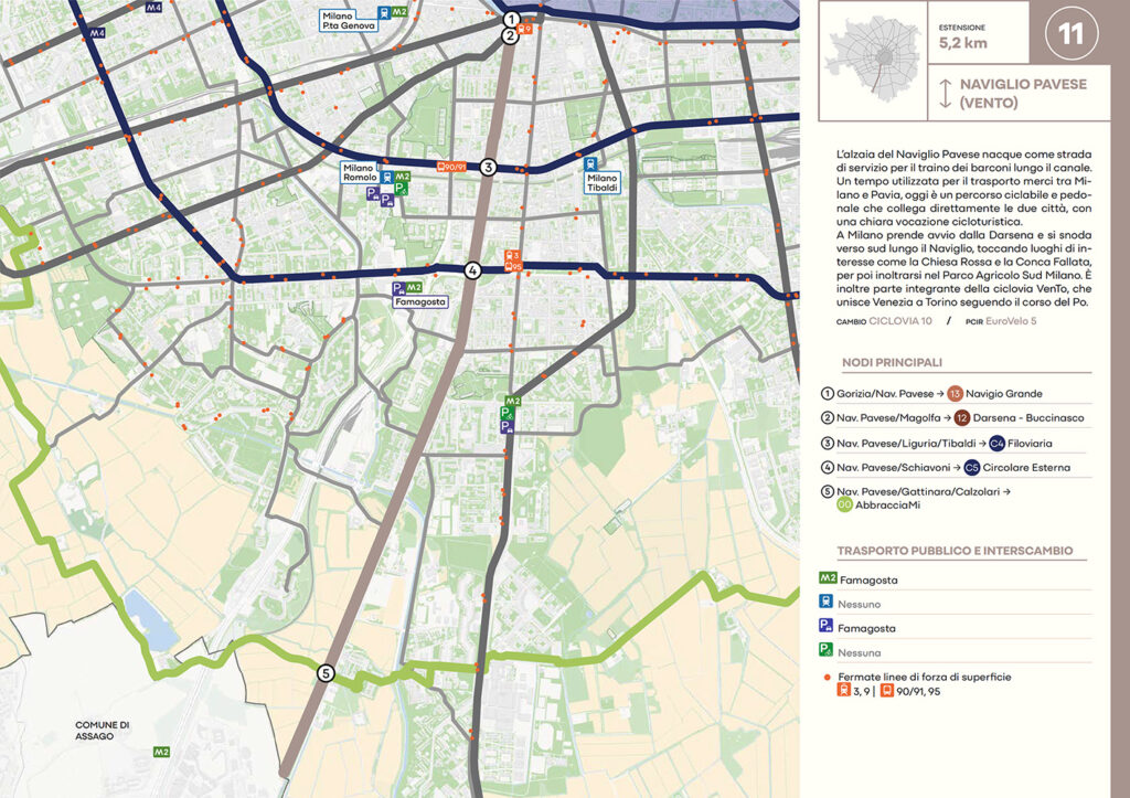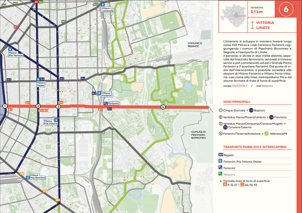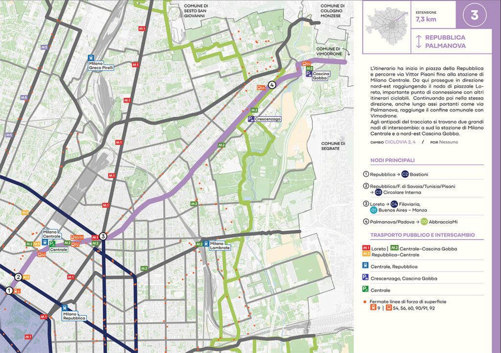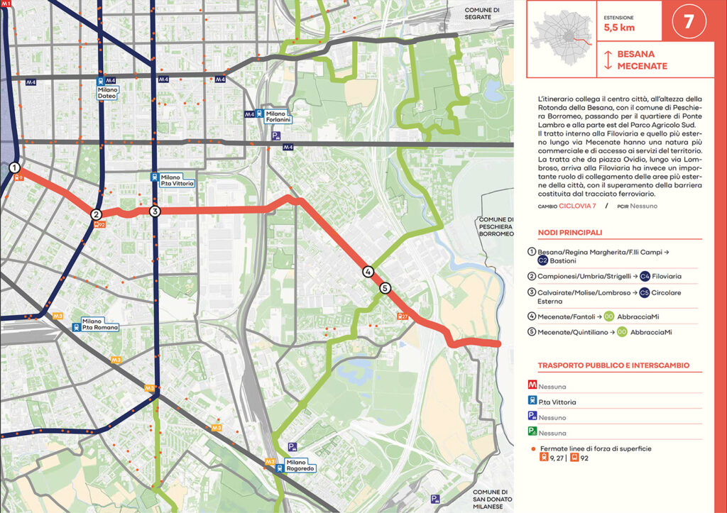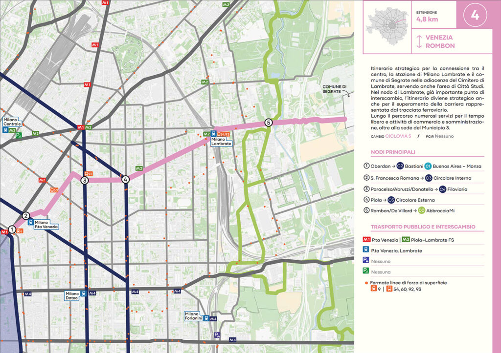 Per quanto riguarda la mobilità ciclabile, il documento prevede una rete complessiva di 565 km, articolata in 210 km di percorsi principali (suddivisi in 29 itinerari) e 355 km secondari. Attualmente è stato realizzato circa il 46% della rete principale. Alcuni tracciati strategici sono già oltre l’80% di completamento, tra cui Buenos Aires-Monza, Gioia-Martesana, Monforte-Corelli, Naviglio Pavese (VenTo), Naviglio Grande, Sempione-Gallarate e Garibaldi-Testi.