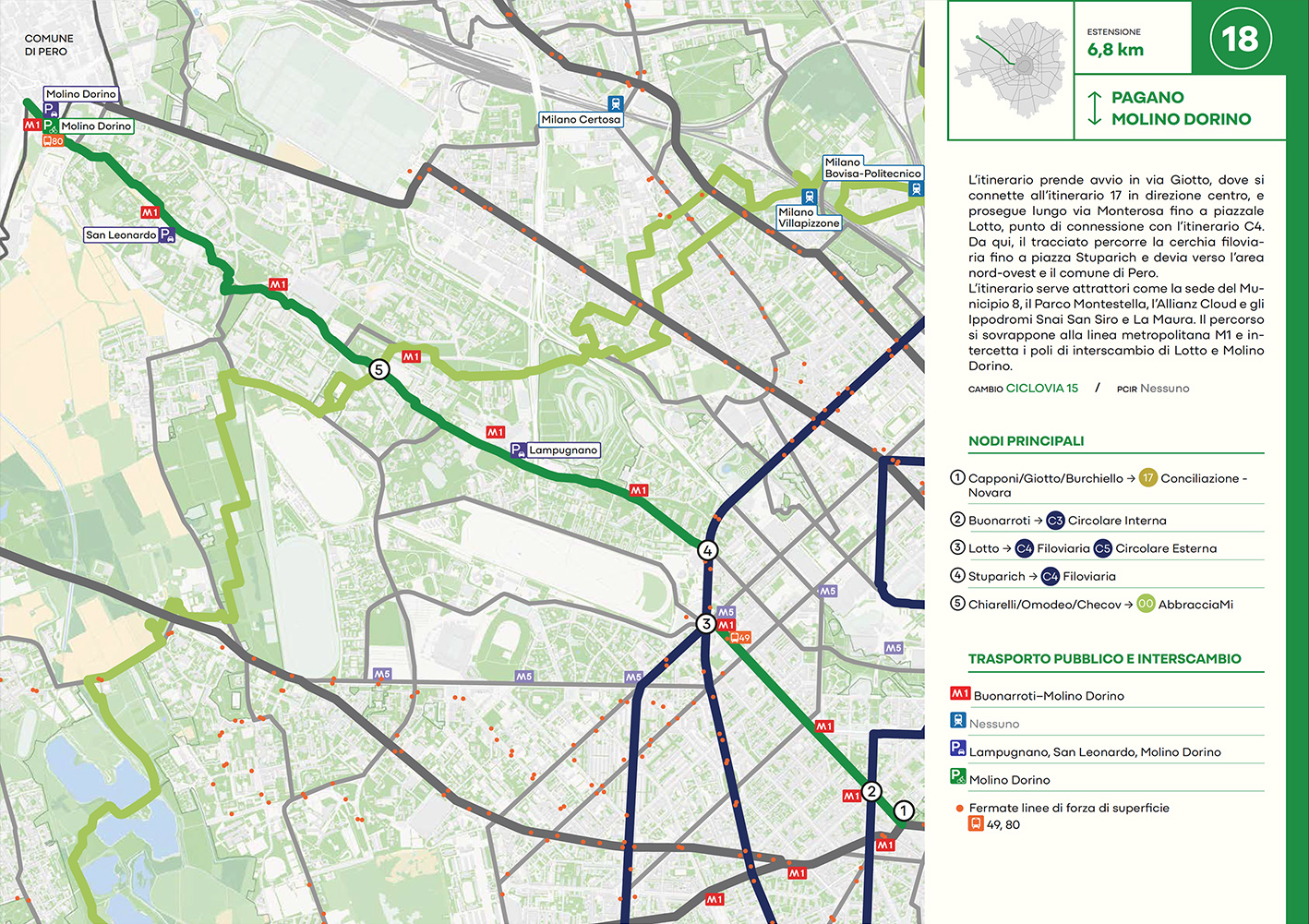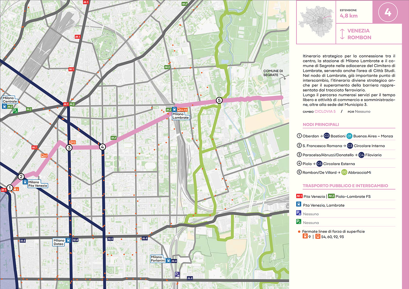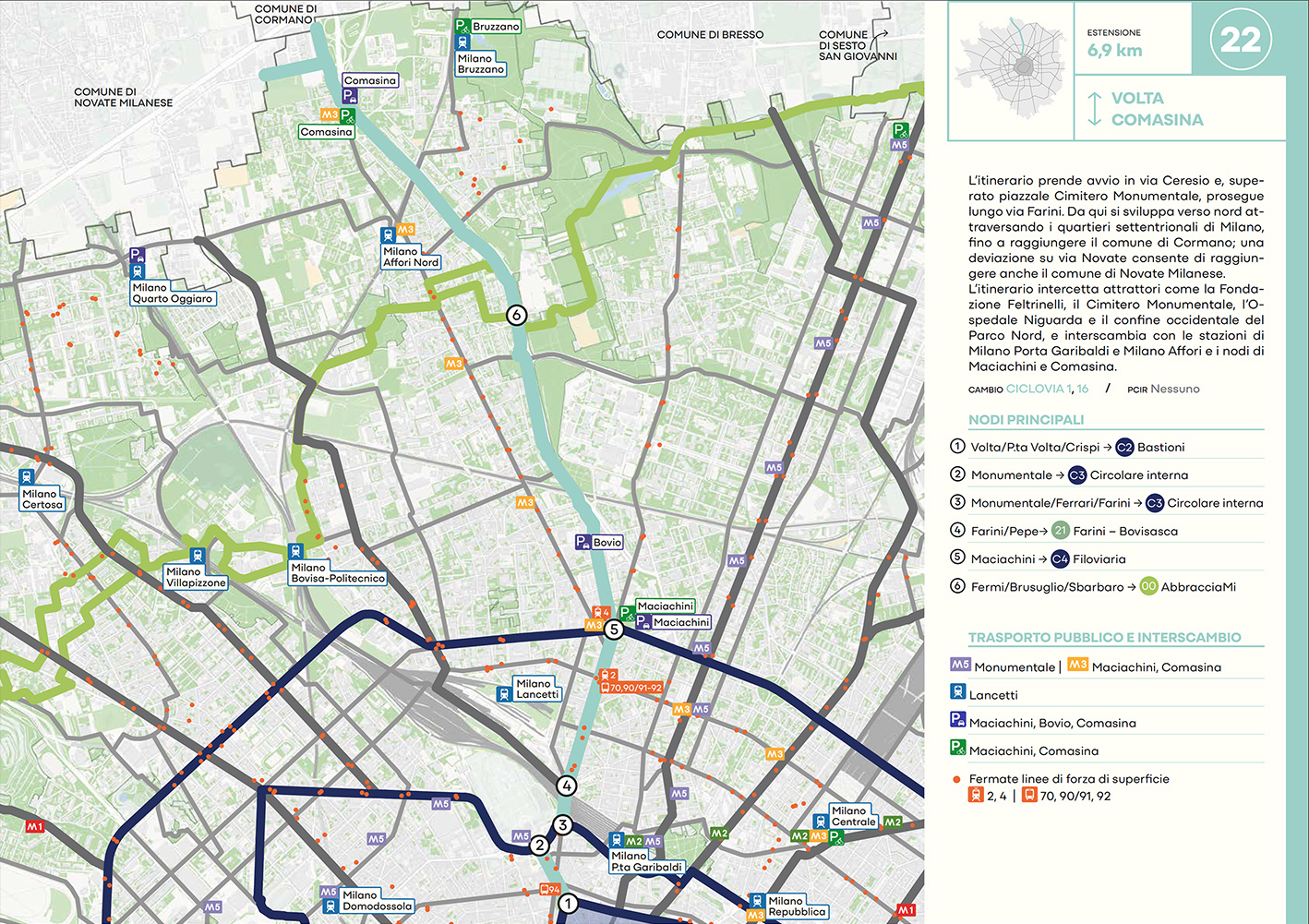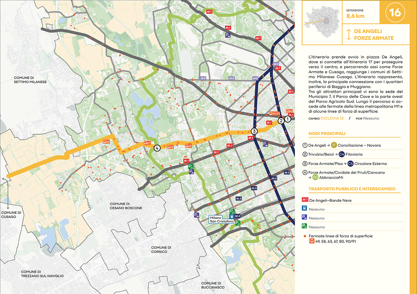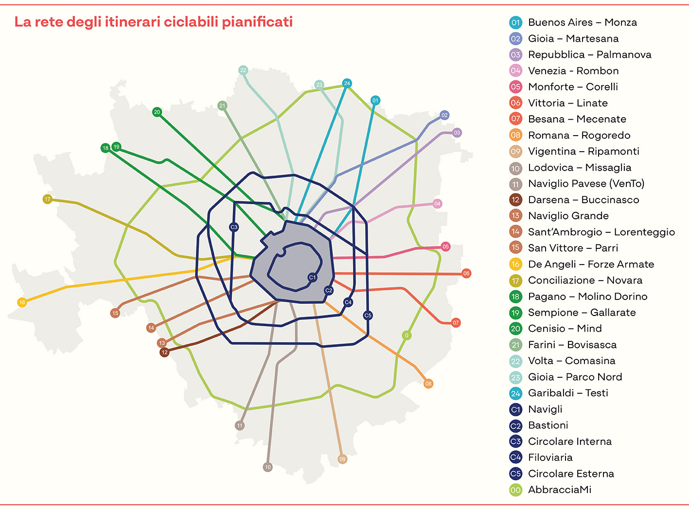 Per quanto riguarda la mobilità ciclabile, il documento prevede una rete complessiva di 565 km, articolata in 210 km di percorsi principali (suddivisi in 29 itinerari) e 355 km secondari. Attualmente è stato realizzato circa il 46% della rete principale. Alcuni tracciati strategici sono già oltre l’80% di completamento, tra cui Buenos Aires-Monza, Gioia-Martesana, Monforte-Corelli, Naviglio Pavese (VenTo), Naviglio Grande, Sempione-Gallarate e Garibaldi-Testi.