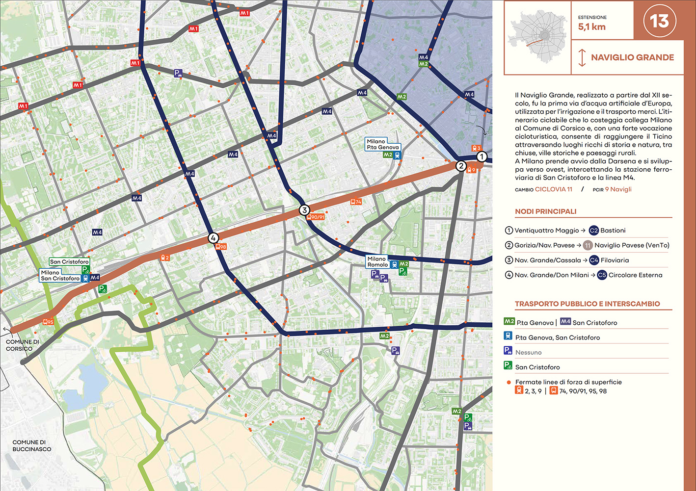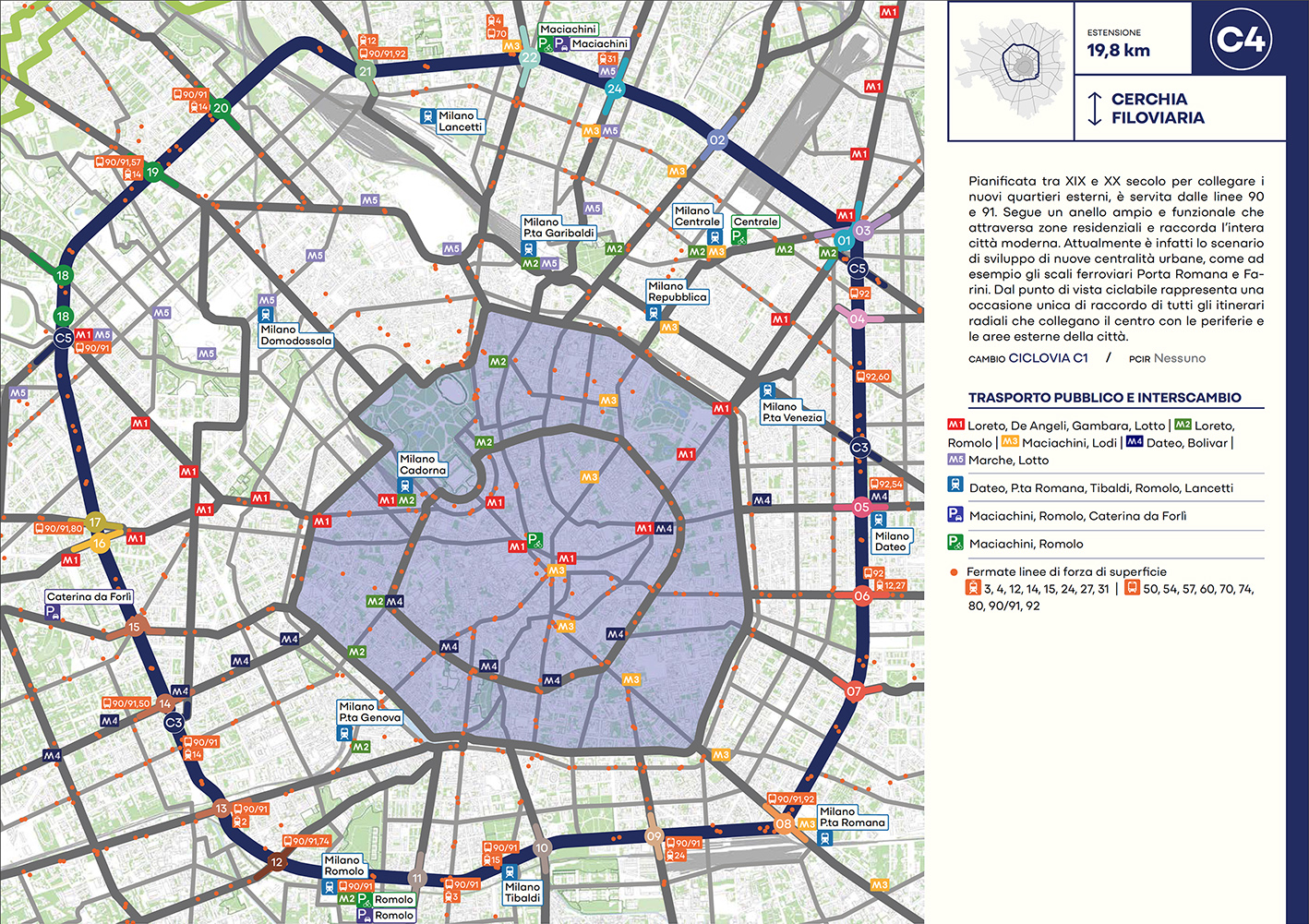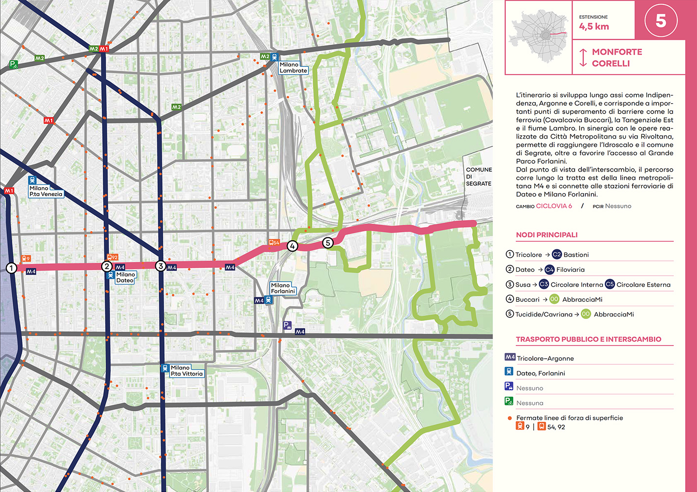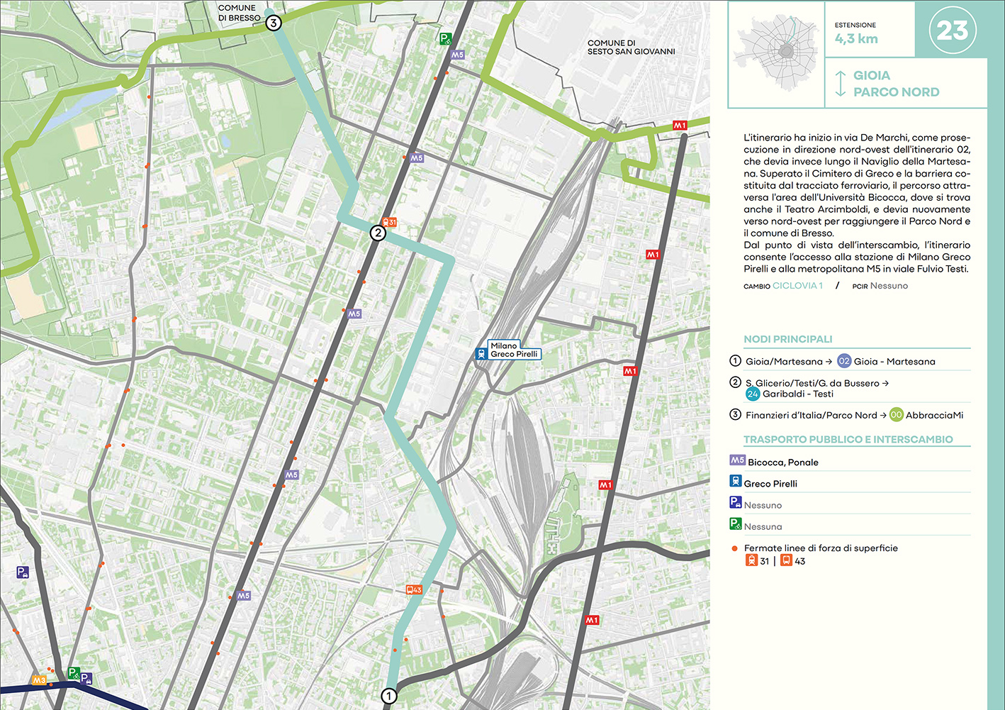 Per quanto riguarda la mobilità ciclabile, il documento prevede una rete complessiva di 565 km, articolata in 210 km di percorsi principali (suddivisi in 29 itinerari) e 355 km secondari. Attualmente è stato realizzato circa il 46% della rete principale. Alcuni tracciati strategici sono già oltre l’80% di completamento, tra cui Buenos Aires-Monza, Gioia-Martesana, Monforte-Corelli, Naviglio Pavese (VenTo), Naviglio Grande, Sempione-Gallarate e Garibaldi-Testi.