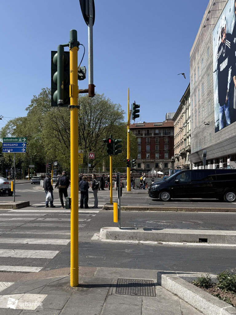Volevamo far notare, come avevamo già mostrato prima dell’avvio delle manifestazioni olimpiche, che molti, ma non tutti, semafori siano stati tinti di giallo, forse esagerando, come in questo caso in piazza Oberdan, dove anche il palo ad arco è diventato di un bel giallo.