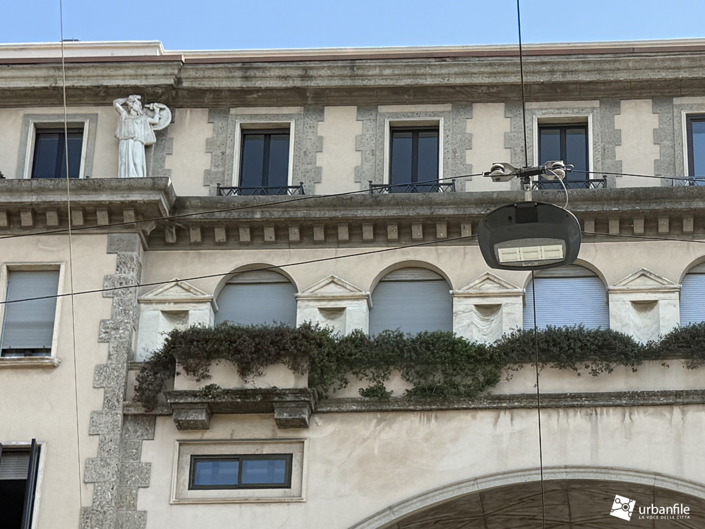 Per anni, l’edificio è rimasto segnato dalla presenza di impalcature sul tetto, installate per un cantiere rimasto fermo per quasi un decennio (lo avevamo segnalato nel 2020). Sebbene poco visibile, questa situazione ha comunque inciso sull’immagine complessiva del palazzo.