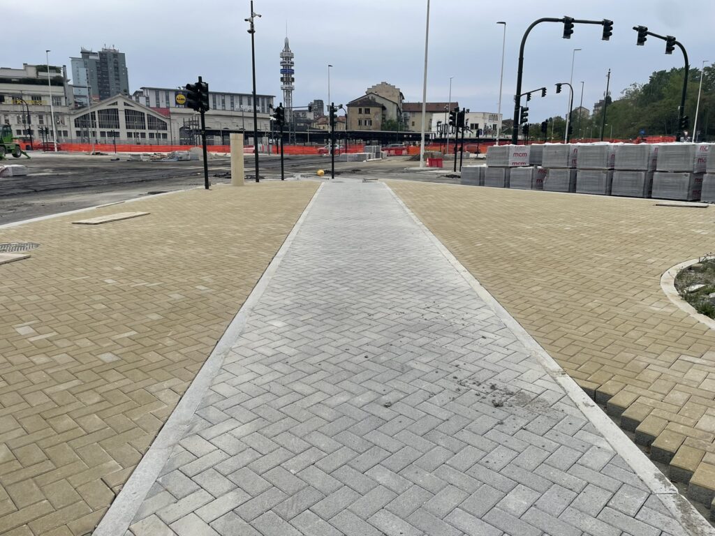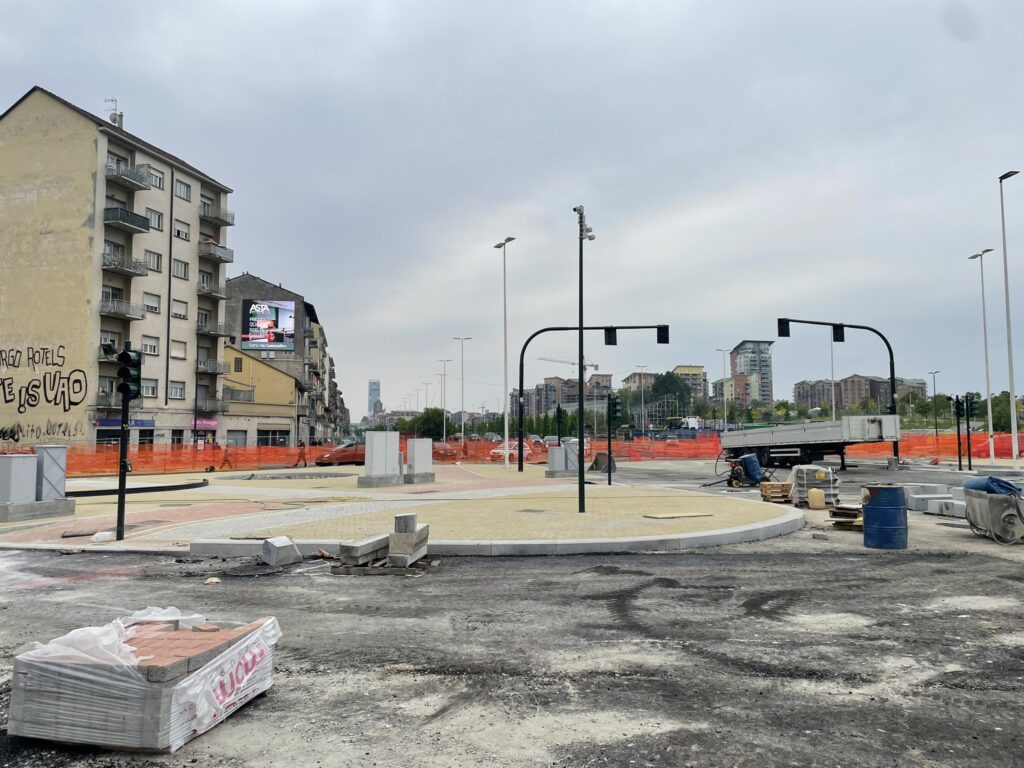 La rotonda centrale di 60 metri di diametro (ridotta rispetto ai 100 metri di prima), è quasi ultimata, con la posa della pavimentazione in pietra di diversi colori che già mostra come sarà la viabilità (veicolare, ciclabile, pedonale) dell’incrocio. Inoltre, è quasi finita l’installazione dei nuovi semafori a controllo remoto h24, e la posa in corso dei binari per il ripristino della linea tramviaria 10 che collegherà Via Cecchi con C.so Vigevano. Rimangono ancora da ultimare le sistemazioni stradali e gli arredi urbani delle isole sulle varie arterie stradali.