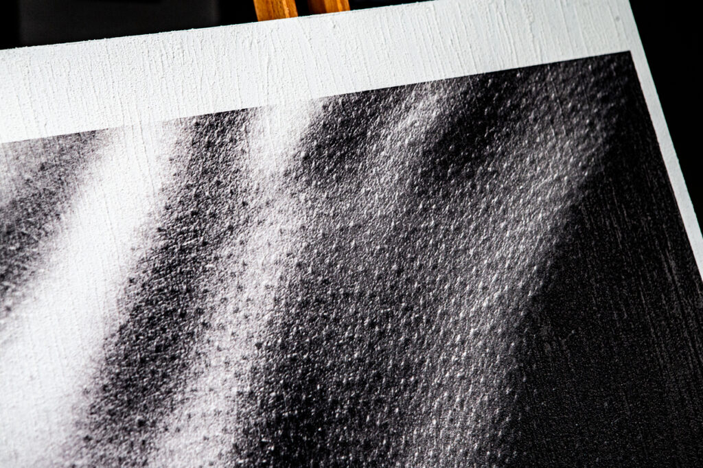 Elemento centrale dell’allestimento è il supporto delle opere. Le fotografie sono stampate su pannelli spatolati in microcemento bianco, una scelta che rafforza la continuità tra immagine e materia e sottolinea la dimensione fisica del racconto.