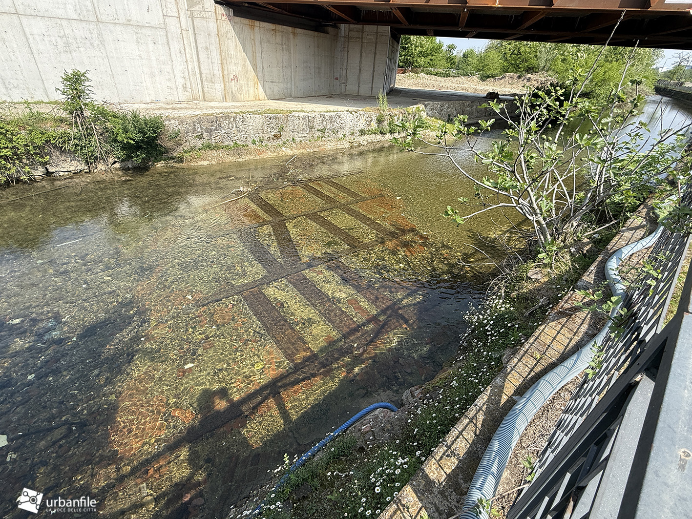 Osservando il fondo del canale, si nota inoltre la presenza di una maglia metallica posta a protezione di un letto in mattoni: una soluzione tecnica di cui, al momento, non è del tutto chiara la funzione.