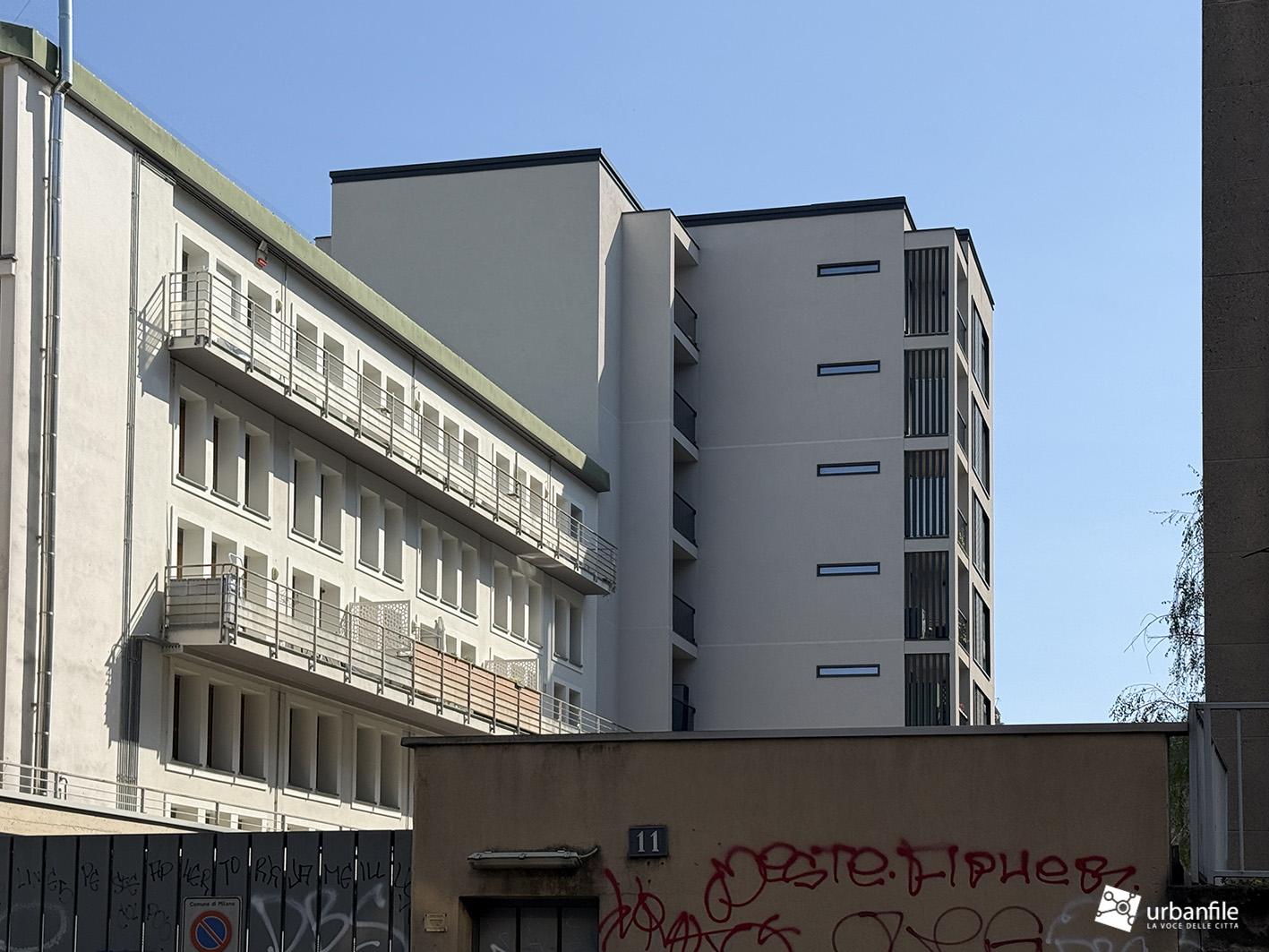 L’edificio si inserisce così in un tessuto urbano eterogeneo, dove convivono architetture di inizio Novecento, ex complessi produttivi riconvertiti e interventi più recenti. La scelta tipologica segue un’impostazione ormai consolidata nell’edilizia residenziale milanese del secondo dopoguerra: logge, frangisole e superfici intonacate, elementi che garantiscono una certa continuità con il costruito circostante, pur senza particolari slanci innovativi.