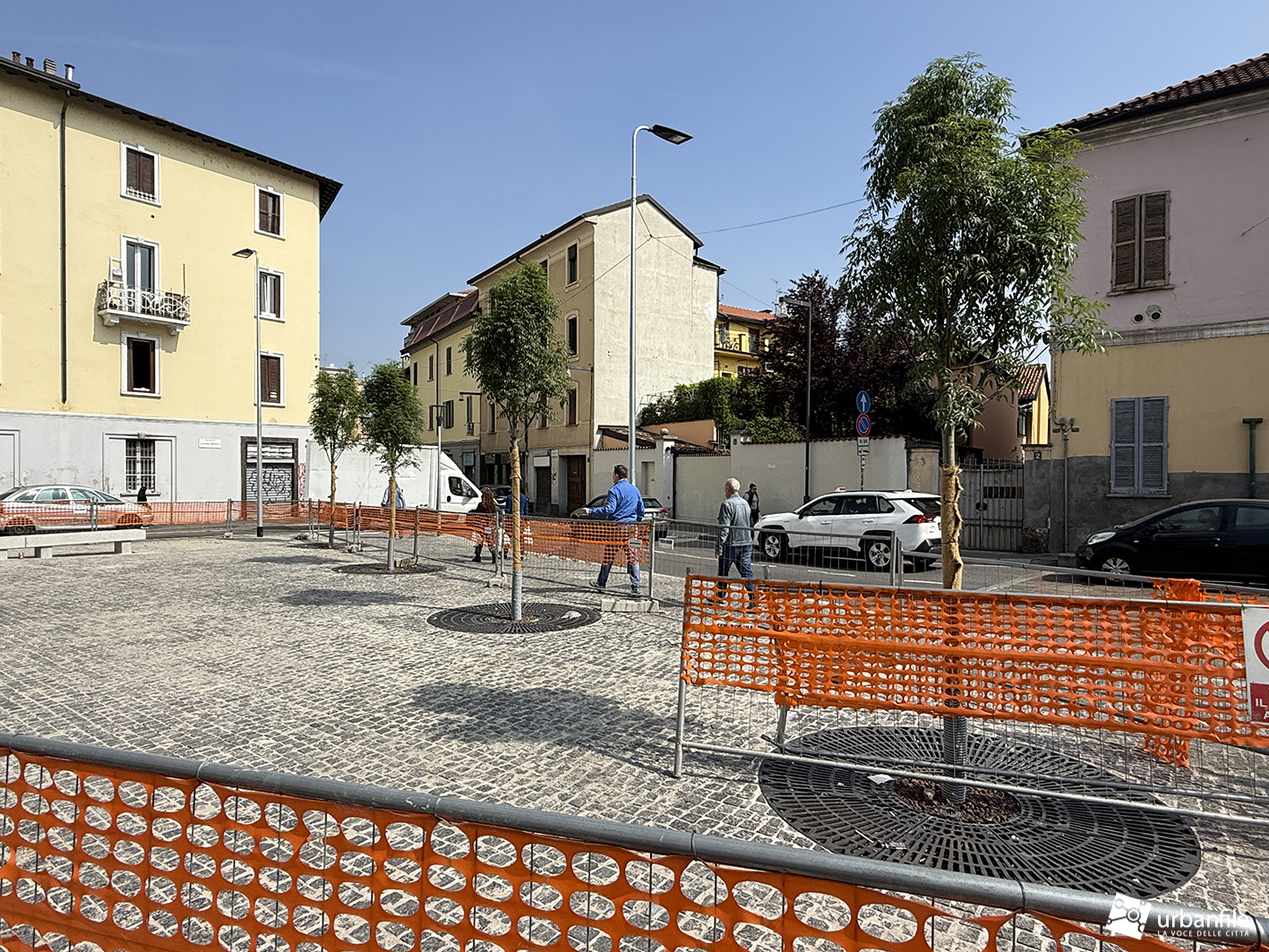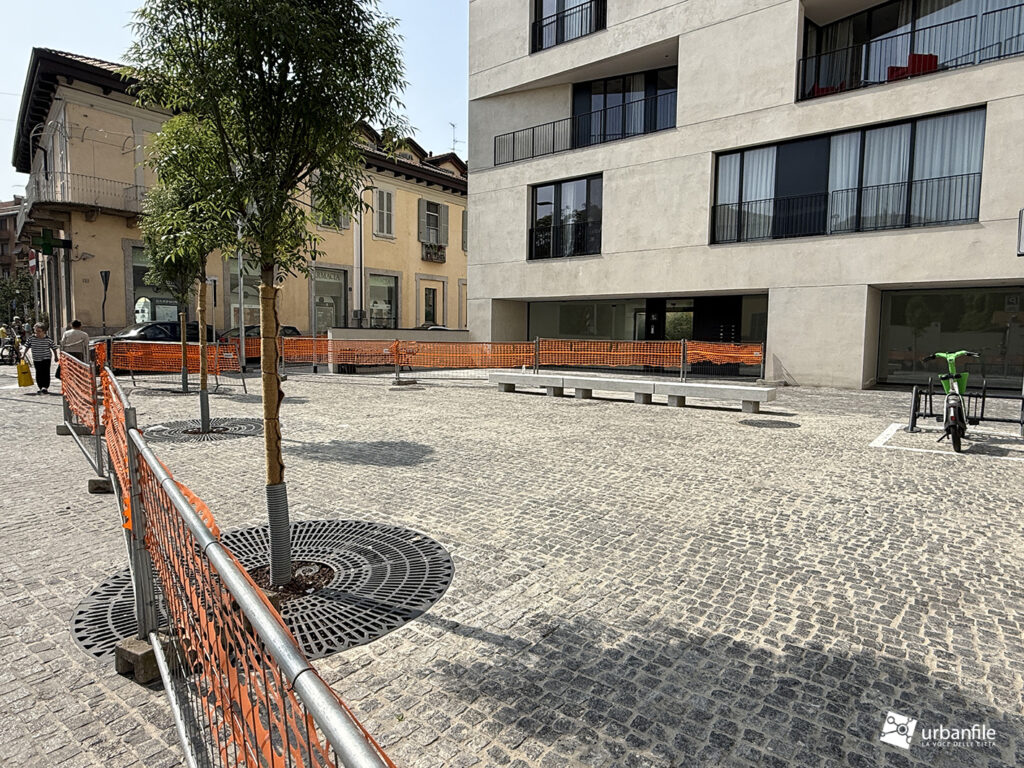 Trattandosi di una piazza pubblica, è probabile che debba essere formalmente collaudata e che siano quindi in corso le necessarie verifiche delle autorità prima della consegna alla cittadinanza, come avevamo sottolineato già la volta scorsa, ma siamo a metà aprile e la situazione è ancora invariata. Intanto gli alberelli hanno attecchito e si sono arricchiti di fogliame verde.