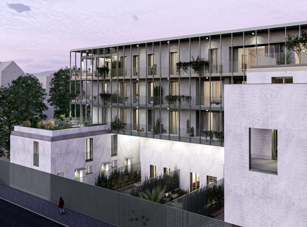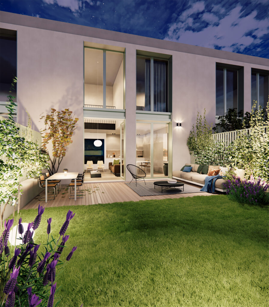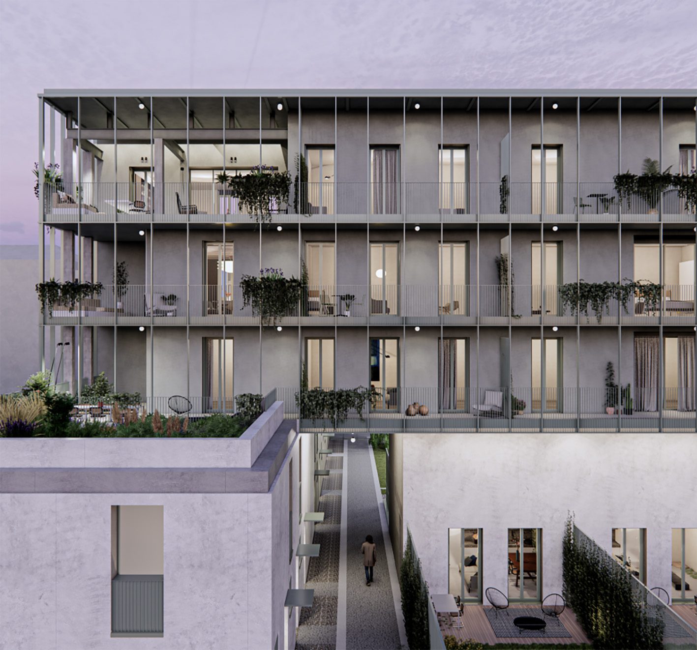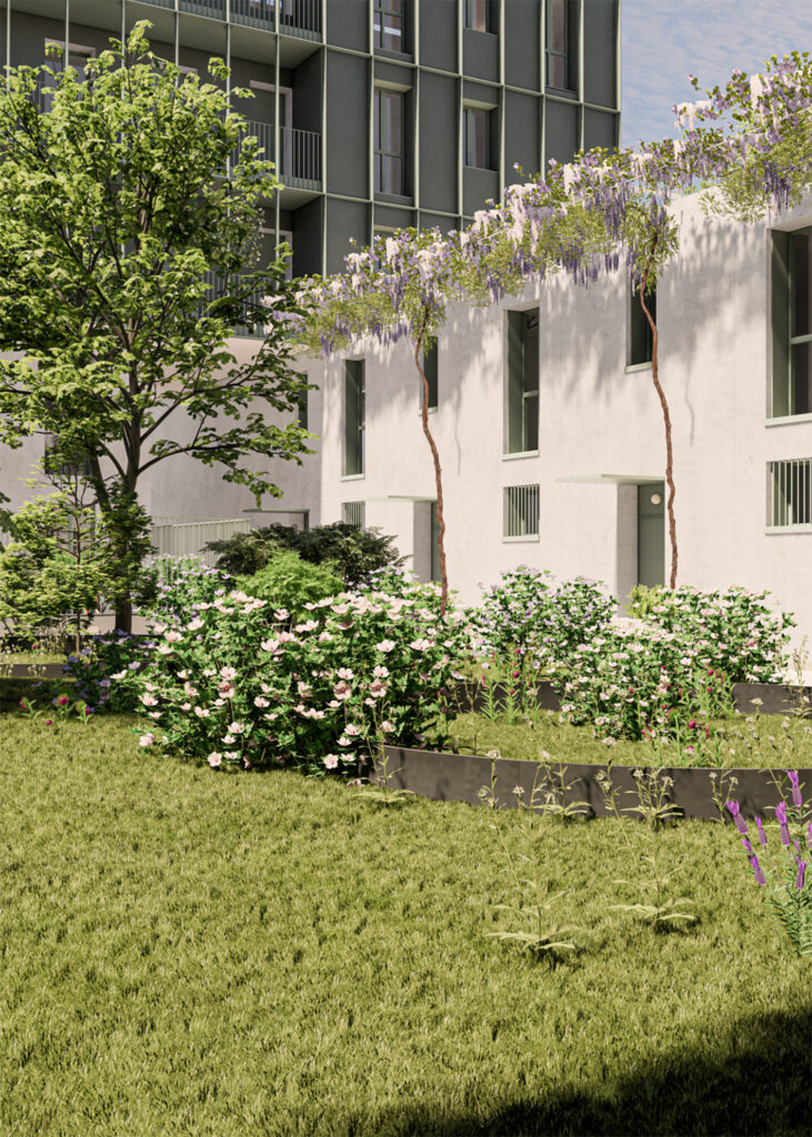 Tutti gli appartamenti dispongono di spazi esterni privati — balconi, logge o giardini — mentre quelli al piano terra presentano doppie altezze e grandi vetrate, reinterpretando il loft in chiave di cortile milanese.
