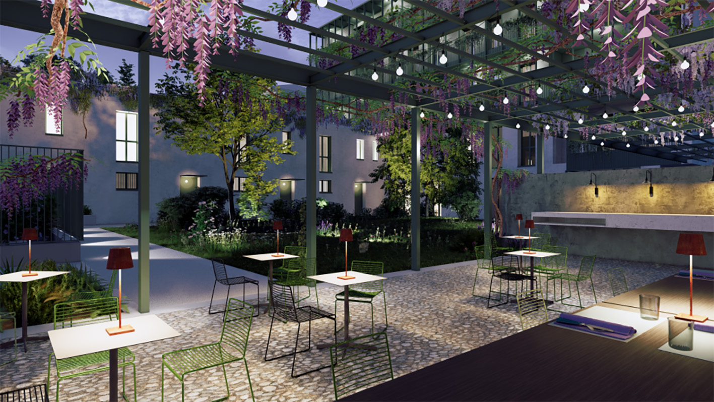 I materiali richiamano la tradizione, con intonaci lavorati, strutture metalliche, pavimentazioni in pietra, rizzata lombarda e sasso lavato.