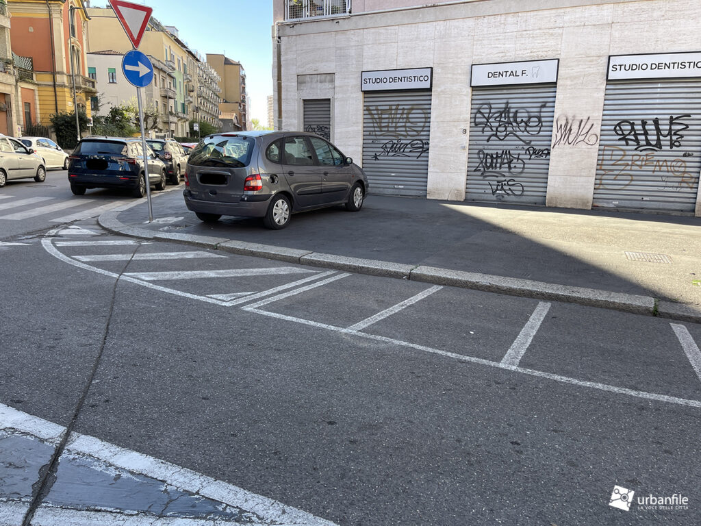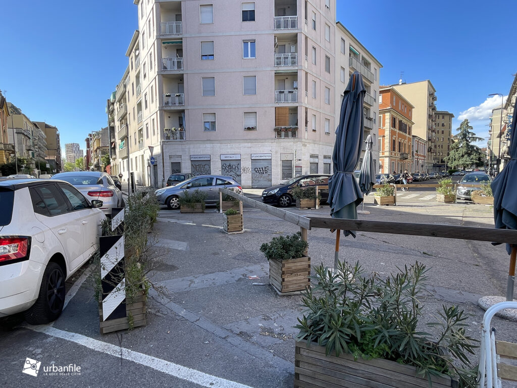 All’altezza dell’incrocio a Y tra via Plana, via Gassendi e via Pacinotti si trova la prima piazzetta senza nome: uno spazio che da sempre viene utilizzato come parcheggio irregolare. Qualche anno fa il bistrot affacciato su questo slargo aveva provato a valorizzarlo con tavolini all’aperto — un primo, timido segnale di possibile riappropriazione dello spazio pubblico. Oggi, però, è tornato a essere terreno di parcheggio selvaggio.