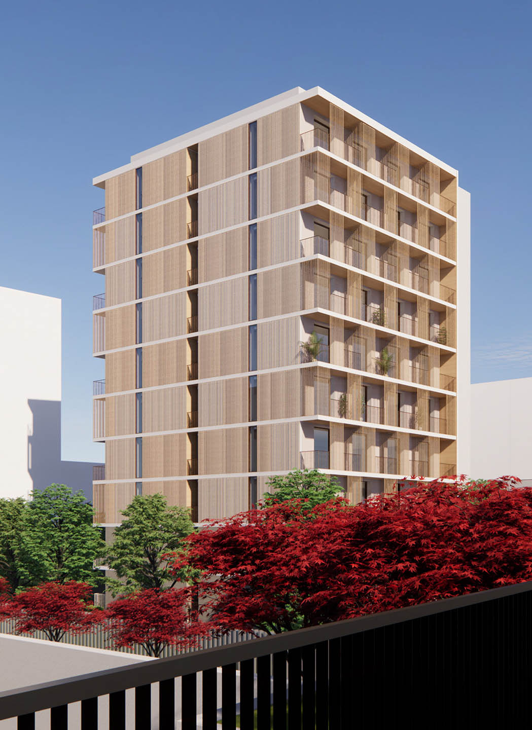 La riconfigurazione volumetrica e architettonica si traduce anche nelle facciate, rimodellando completamente l’assetto esistente; l’intervento prevede affacci finestrati più ampi e spazi esterni per tutte le unità residenziali, con un’alternanza di pieni e vuoti, logge e partizioni opache, armonizzata dalla cura delle proporzioni e dalla presenza di elementi frangisole verticali e parapetti in lamiera microforata. Per il piano terra, rivestito in Ceppo di Gré, è stato mantenuto il fronte commerciale con piccole e medie strutture di vendita.