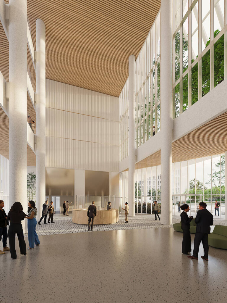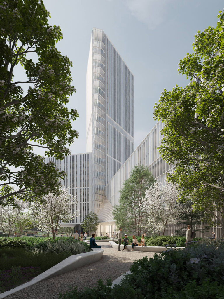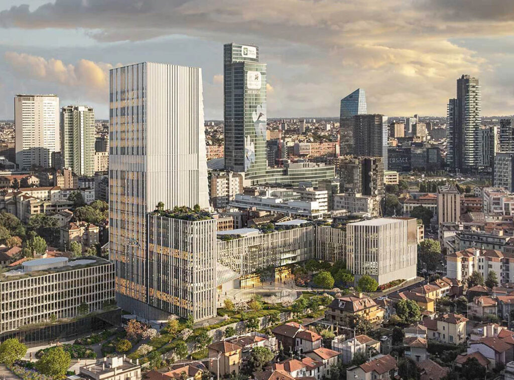 L’edificio stesso ha una struttura urbana orizzontale che culmina con una torre di 29 piani verso via Rosellini. La verticalità è enfatizzata da terrazze verdi a doppia e tripla altezza, visibili all’esterno grazie a pannelli di vetro fotovoltaico modulari. Questo rapporto costante con la natura crea un ambiente biofilico dove l’architettura sostenibile e la qualità degli spazi interni promuovono il benessere individuale.